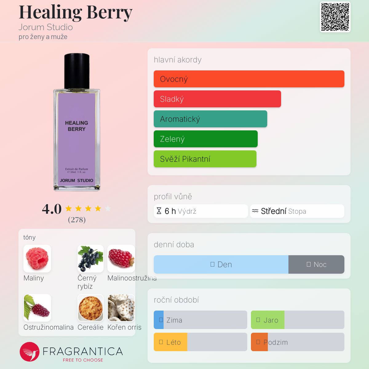 Healing Berry podle Jorum Studio je vůně pro ženy a muže. Healing Berry byl/a uveden/a v roce 2022. "Nosem" za touto vůní je Euan McCall. Vrchní tóny jsou Černý rybíz, Malinoostružina, Fialkový list, Máta, Pelyněk a Vrbovka růžová; střední tóny jsouMalinový list, Ostružinomalina, Orris, Růže a Kapradina ; základní tóny jsou Cereálie a Jedle balzámová.