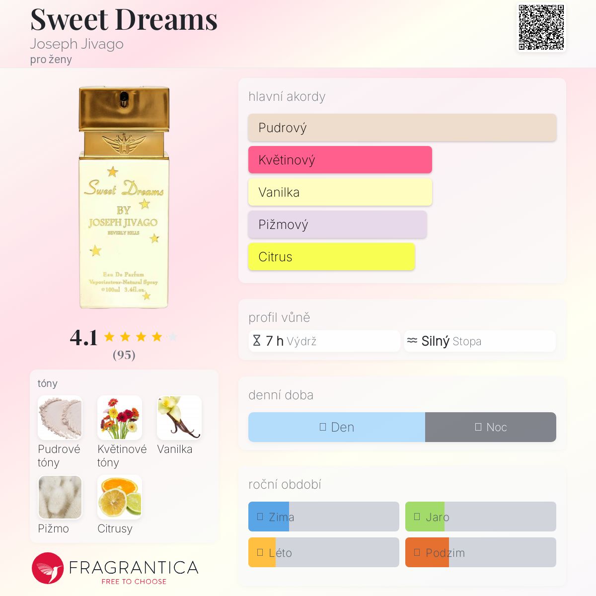 Sweet Dreams podle Joseph Jivago je Floral vůně pro ženy. Vrchní tón je Citrusy ; střední tóny jsouPudrové tóny a Květinové tóny ; základní tóny jsou Vanilka a Bílé pižmo.