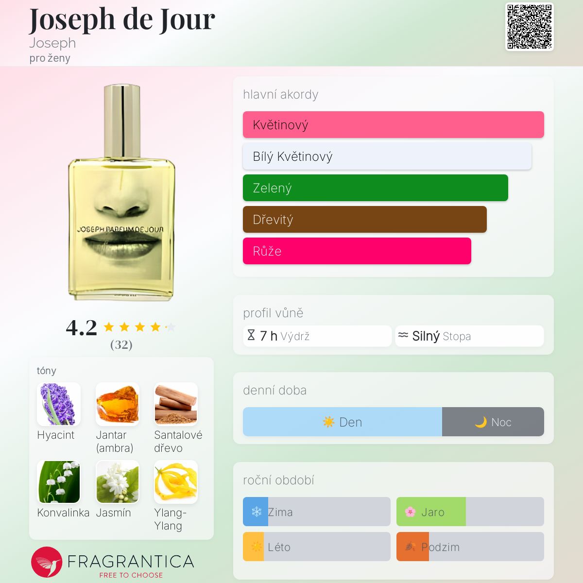 Joseph de Jour podle Joseph je Floral Woody Musk vůně pro ženy. Joseph de Jour byl/a uveden/a v roce 1997. Vrchní tóny jsou Hyacint a Konvalinka; střední tóny jsouJasmín, Ylang-Ylang a Růže ; základní tóny jsou Jantar (ambra) a Santalové dřevo.