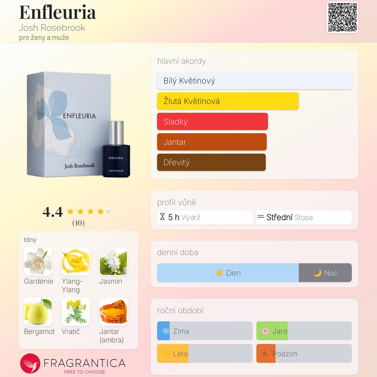 Enfleuria podle Josh Rosebrook je Floral vůně pro ženy a muže. Enfleuria byl/a uveden/a v roce 2020. Vrchní tóny jsou Gardénie a Bergamot; střední tóny jsouYlang-Ylang, Jasmín a Vratič ; základní tóny jsou Jantar (ambra), Ambrette (přírodní pižmo) a Labdanum.