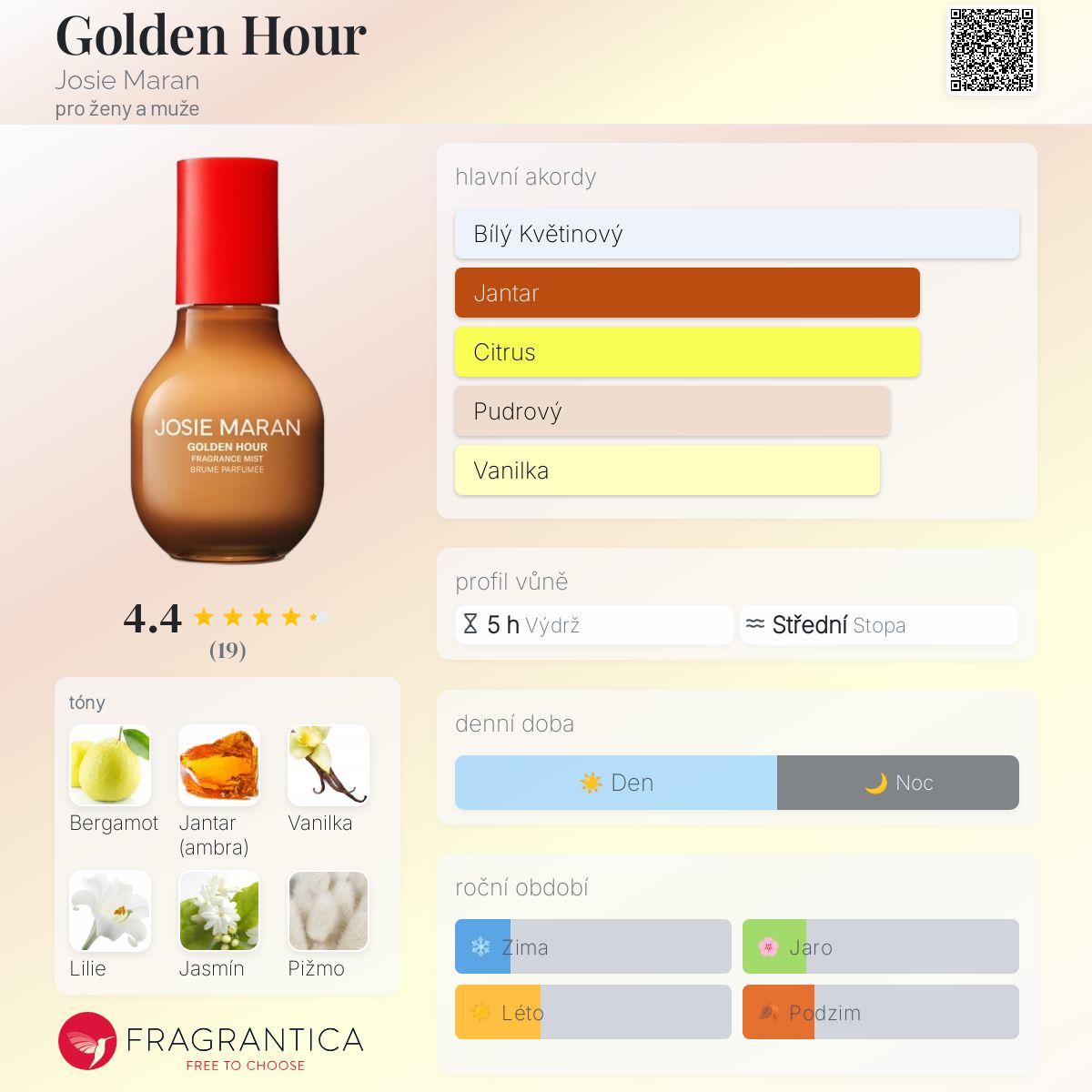 Golden Hour podle Josie Maran je Orientální Floral vůně pro ženy a muže. Toto je nová vůně. Golden Hour byl/a uveden/a v roce 2025. "Nosem" za touto vůní je Jérôme Epinette. Vrchní tóny jsou Bergamot a Jasmín; střední tóny jsouVanilkový lusk a Lilie ; základní tóny jsou Jantar (ambra), Bílé pižmo a Santalové dřevo.