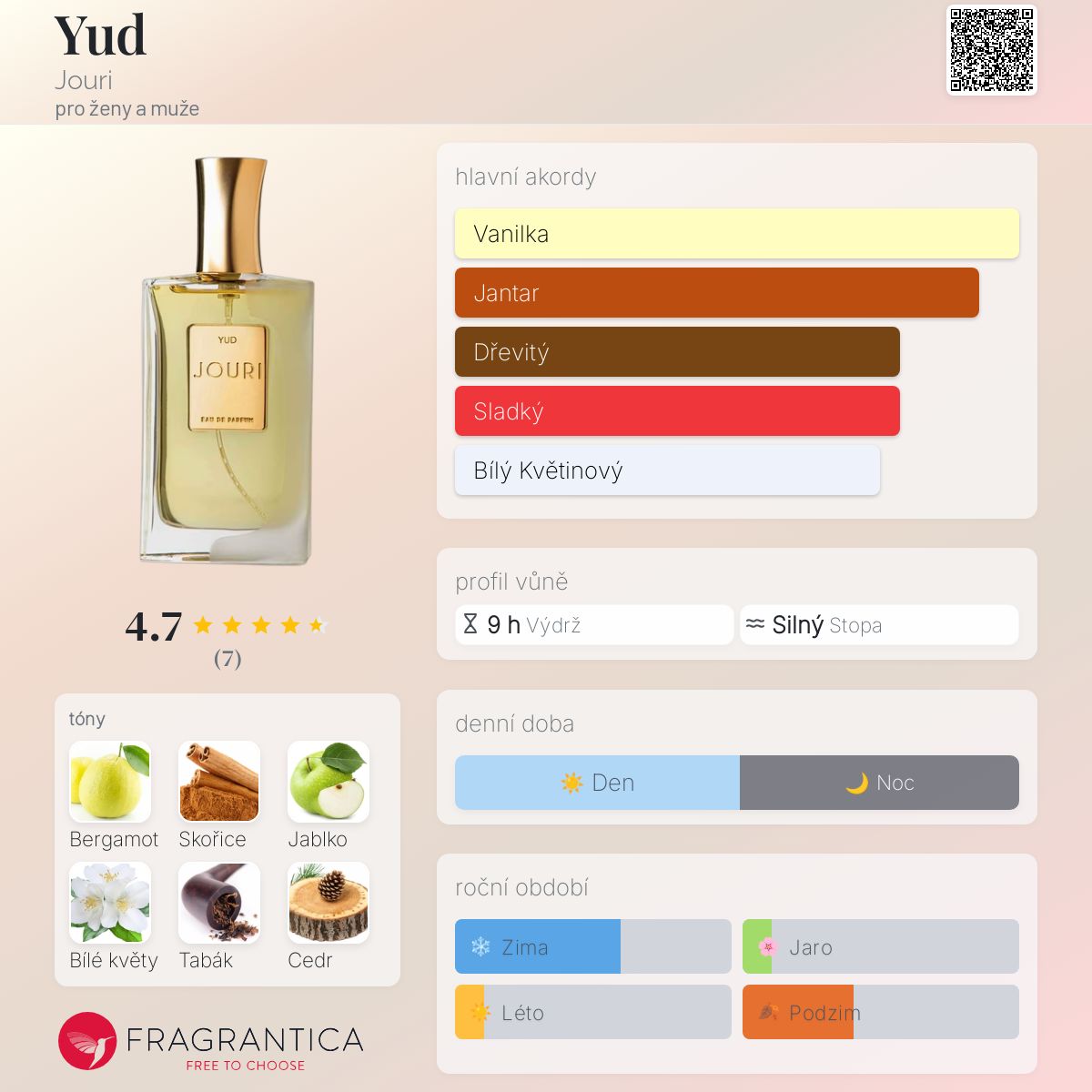 Yud podle Jouri je Woody Spicy vůně pro ženy a muže. Yud byl/a uveden/a v roce 2017. "Nosem" za touto vůní je Ali Abdulla Almarzooqi. Vrchní tóny jsou Bergamot, Skořice a Jablko; střední tóny jsouBílé květy, Tabák a Cedr ; základní tóny jsou Jantar (ambra), Fazole tonka a Vanilka.