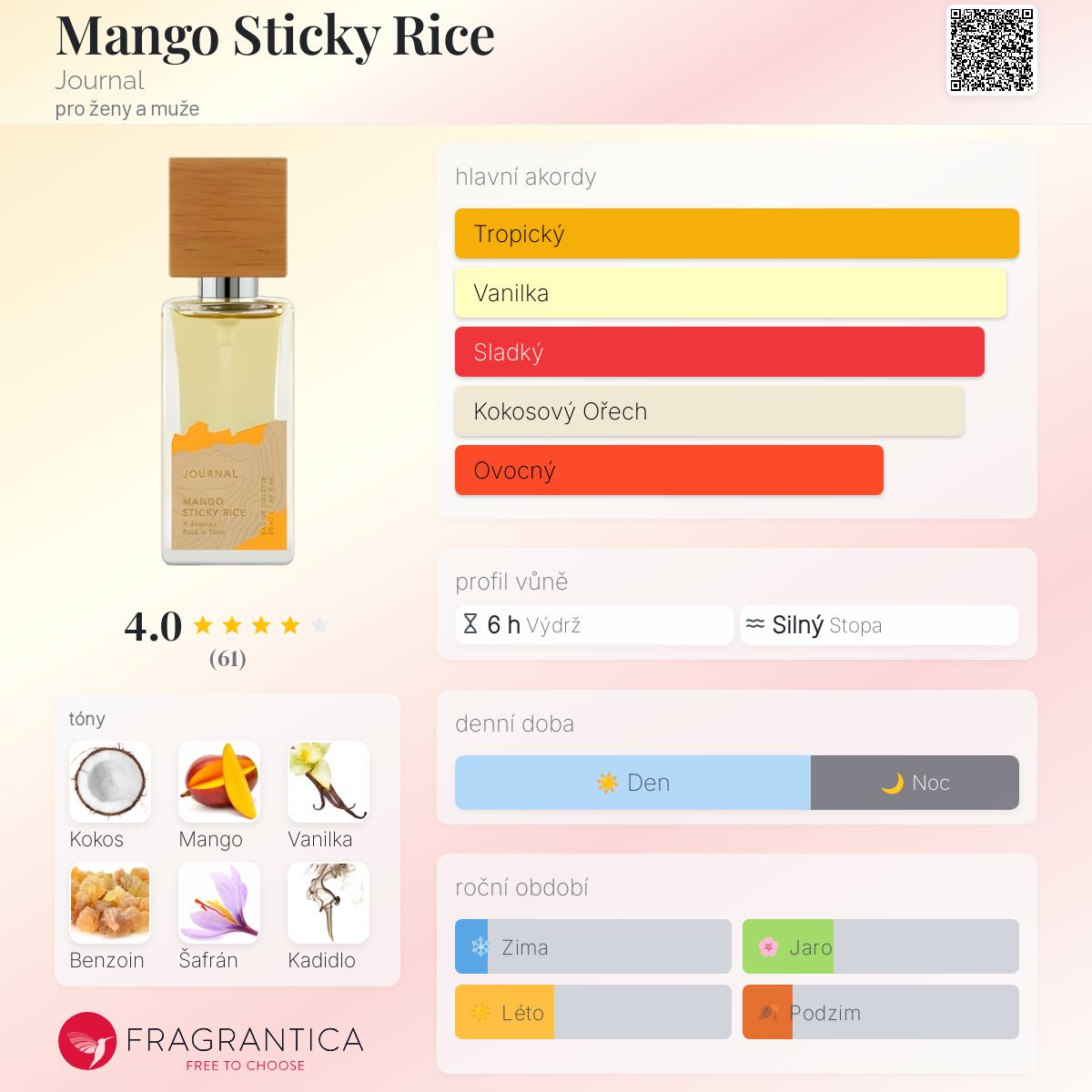 Mango Sticky Rice podle Journal je Floral Fruity Gourmand vůně pro ženy a muže. Mango Sticky Rice byl/a uveden/a v roce 2020. Vrchní tóny jsou Kokosové mléko, Kokos a Mango; střední tón jeVanilka ; základní tóny jsou Siamský (thajský) benzoin, Šafrán, Kadidlo a Agarové dřevo (oud).