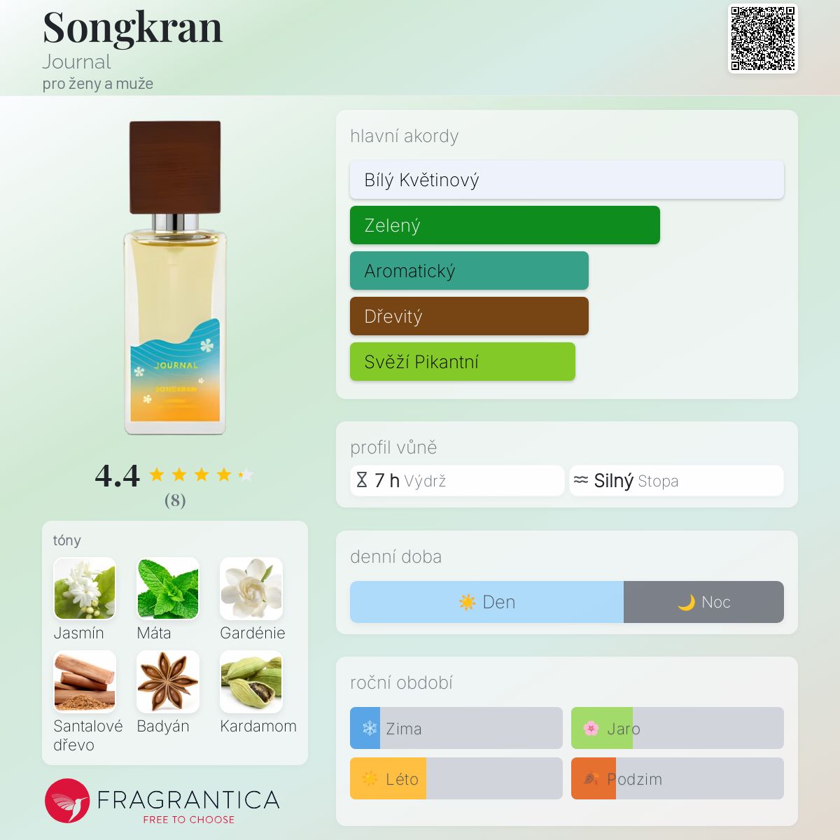 Songkran podle Journal je vůně pro ženy a muže. Vrchní tóny jsou Jasmín a Gardénie; střední tóny jsouMáta, Badyán a Kardamom ; základní tóny jsou Santalové dřevo a Agarové dřevo (oud).