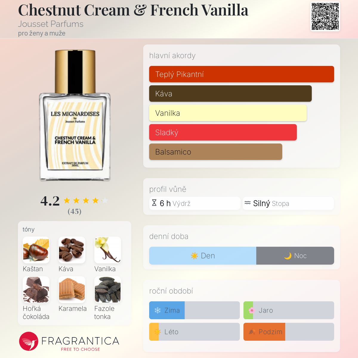 Chestnut Cream & French Vanilla podle Jousset Parfums je vůně pro ženy a muže. Chestnut Cream & French Vanilla byl/a uveden/a v roce 2021. "Nosem" za touto vůní je Jimmy Bodin. Vrchní tóny jsou Kaštan, Káva a Vanilka; střední tóny jsouČokoláda a Fazole tonka ; základní tóny jsou Vanilka, Karamela a Peruánský balzám.