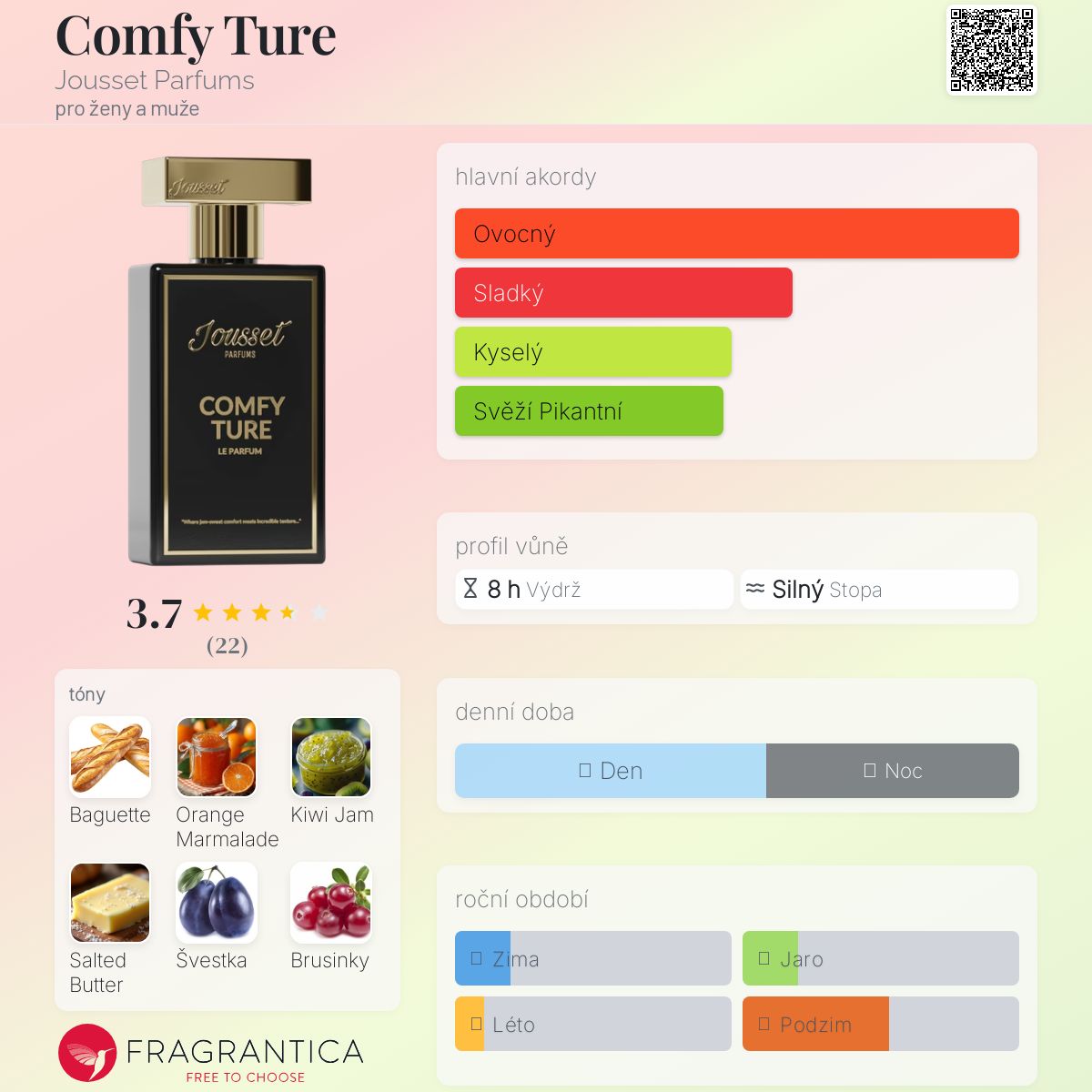 Comfy Ture podle Jousset Parfums je Floral Fruity Gourmand vůně pro ženy a muže. Toto je nová vůně. Comfy Ture byl/a uveden/a v roce 2025. "Nosem" za touto vůní je Jimmy Bodin. Vrchní tóny jsou Orange Marmalade a Kiwi Jam; střední tóny jsouŠvestka a Brusinky ; základní tóny jsou Baguette a Salted Butter.