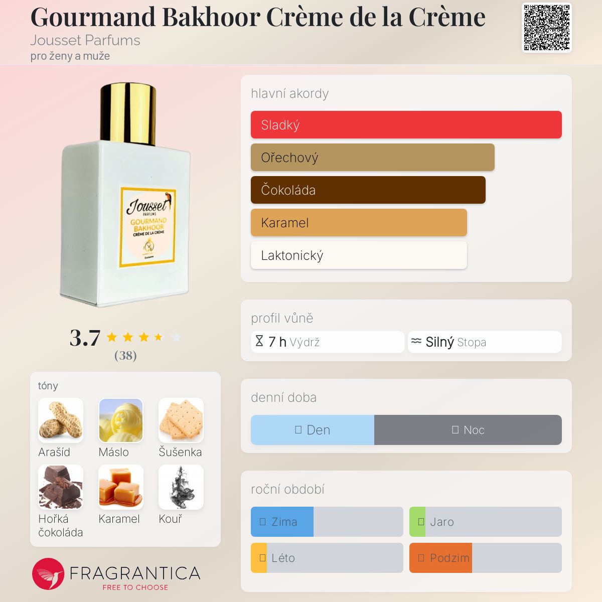 Gourmand Bakhoor Crème de la Crème podle Jousset Parfums je Orientální Vanilla vůně pro ženy a muže. Gourmand Bakhoor Crème de la Crème byl/a uveden/a v roce 2020. Vrchní tóny jsou Arašíd, Máslo a Čokoláda; střední tóny jsouŠušenka a Karamel ; základní tóny jsou Kouř a Vanilka.