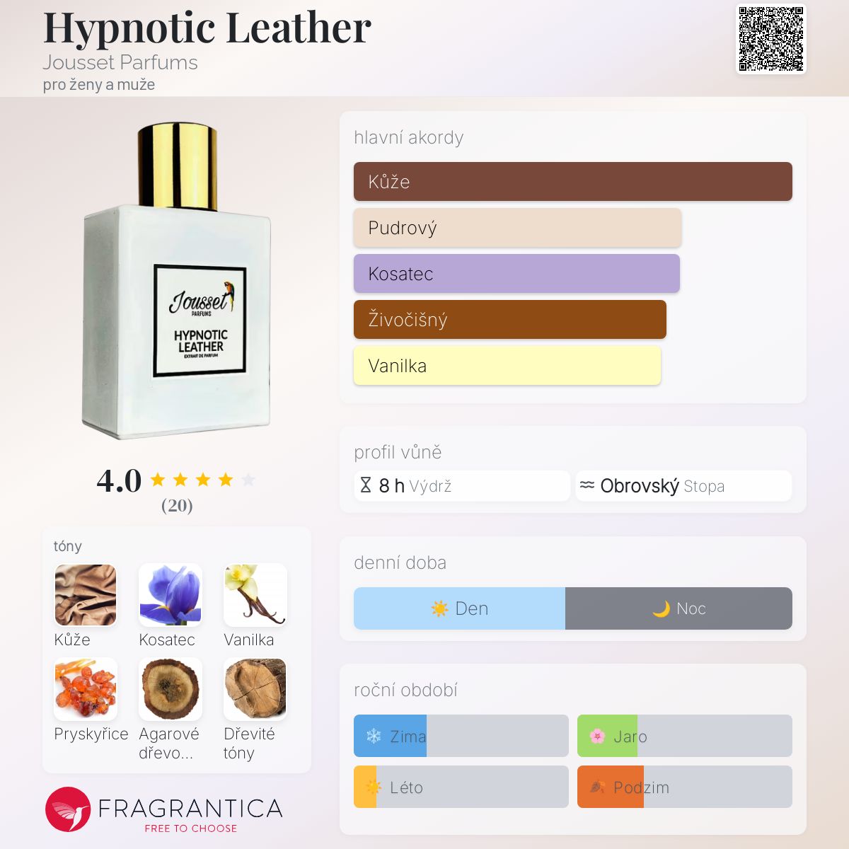 Hypnotic Leather podle Jousset Parfums je Orientální vůně pro ženy a muže. Hypnotic Leather byl/a uveden/a v roce 2020. "Nosem" za touto vůní je Jimmy Bodin. Vrchní tóny jsou Pryskyřice a Bergamot; střední tóny jsouKůže, Kosatec a Dřevité tóny ; základní tóny jsou Vanilka, Agarové dřevo (oud) a Pižmo.