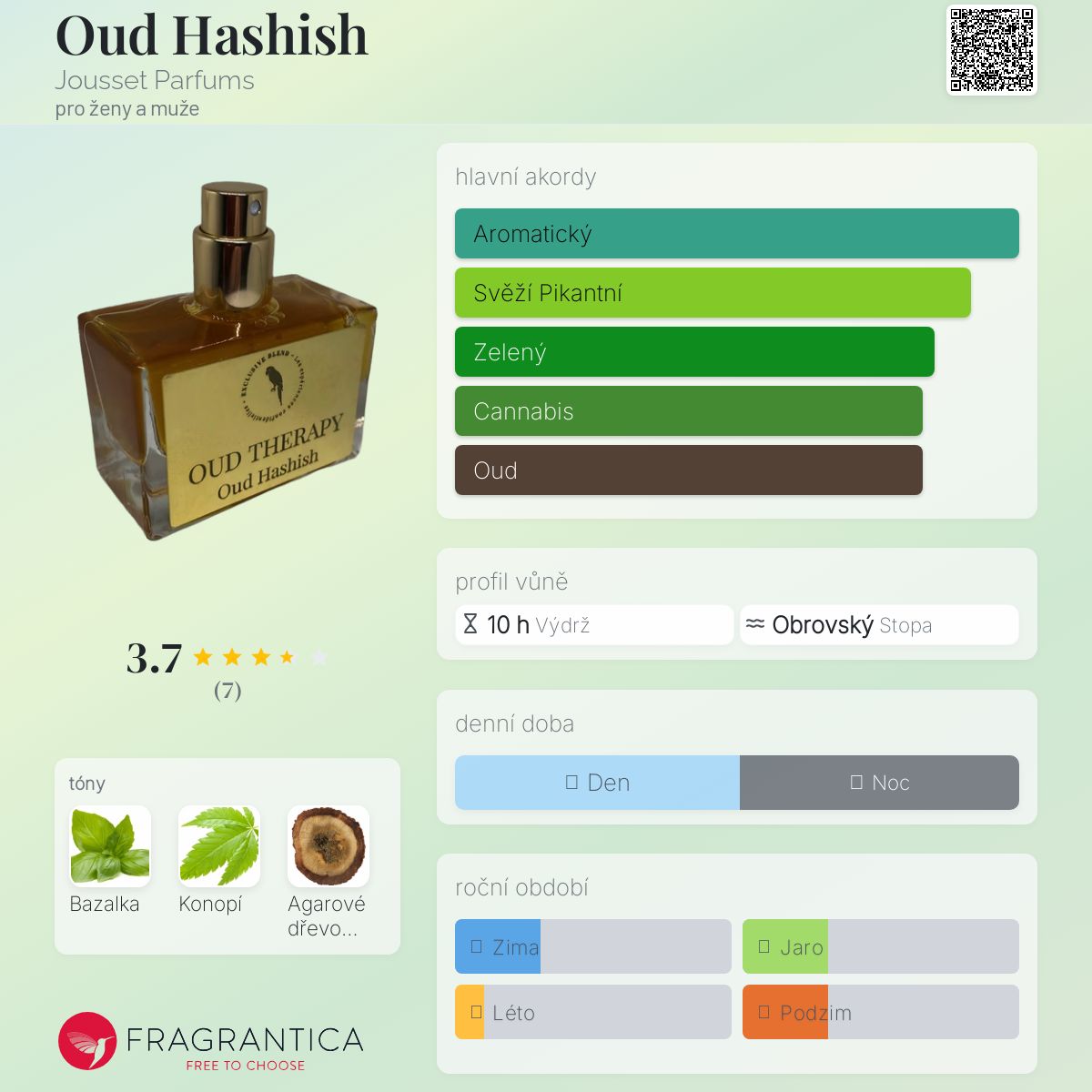 Oud Hashish podle Jousset Parfums je vůně pro ženy a muže. Oud Hashish byl/a uveden/a v roce 2021. "Nosem" za touto vůní je Jimmy Bodin. Vrchní tón je Bazalka ; střední tón jeKonopí ; základní tón je Agarové dřevo (oud).