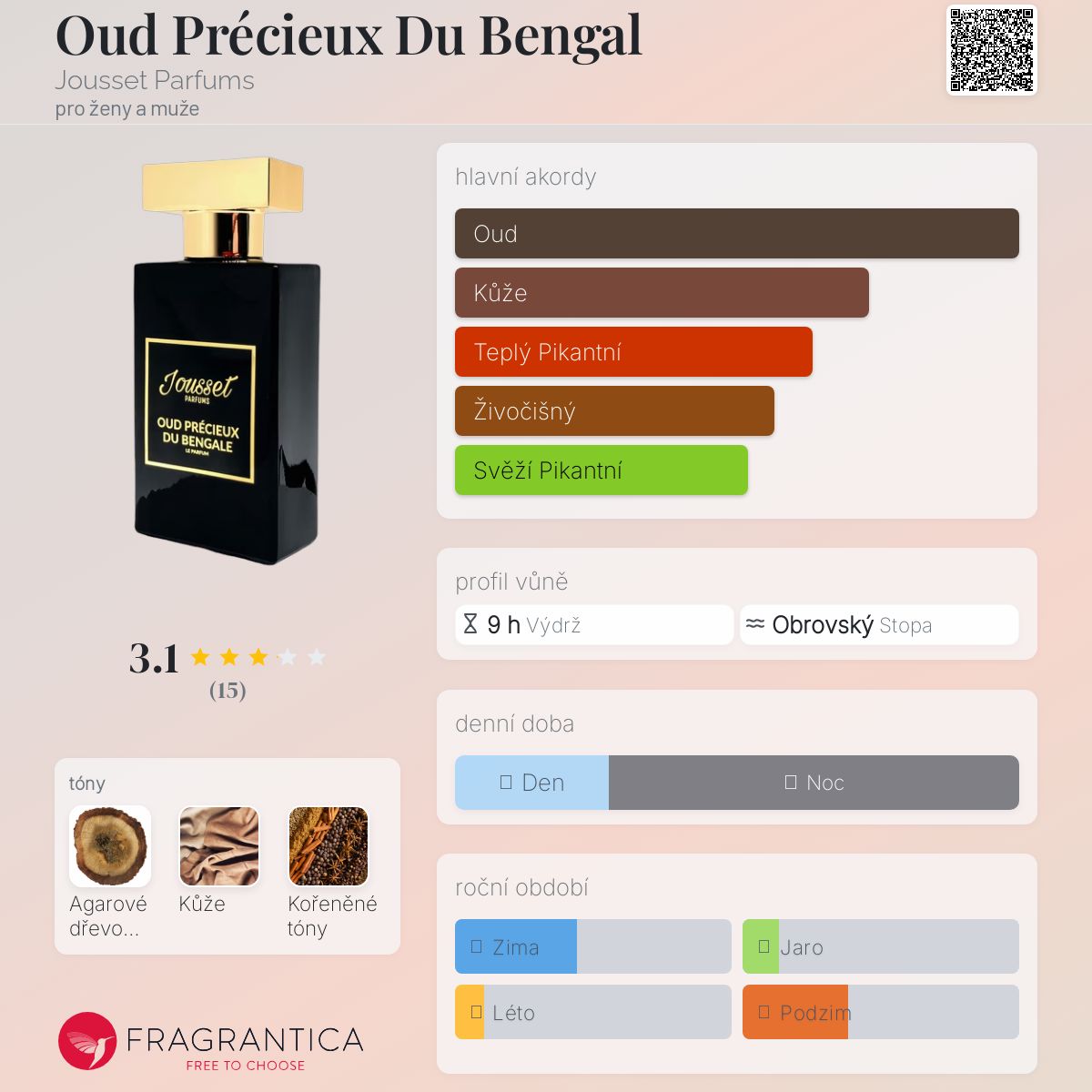 Oud Précieux Du Bengal podle Jousset Parfums je vůně pro ženy a muže. Oud Précieux Du Bengal byl/a uveden/a v roce 2021. "Nosem" za touto vůní je Jimmy Bodin. Vrchní tóny jsou Agarové dřevo (oud) a Kůže; střední tóny jsouAgarové dřevo (oud) a Koření ; základní tón je Agarové dřevo (oud).