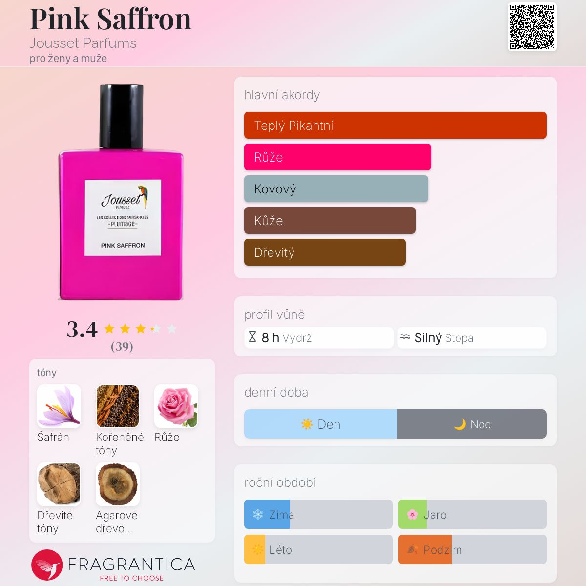 Pink Saffron podle Jousset Parfums je Orientální vůně pro ženy a muže. Pink Saffron byl/a uveden/a v roce 2020. "Nosem" za touto vůní je Jimmy Bodin. Vrchní tón je Šafrán ; střední tóny jsouKořeněné tóny a Růže ; základní tóny jsou Šafrán, Dřevité tóny a Agarové dřevo (oud).