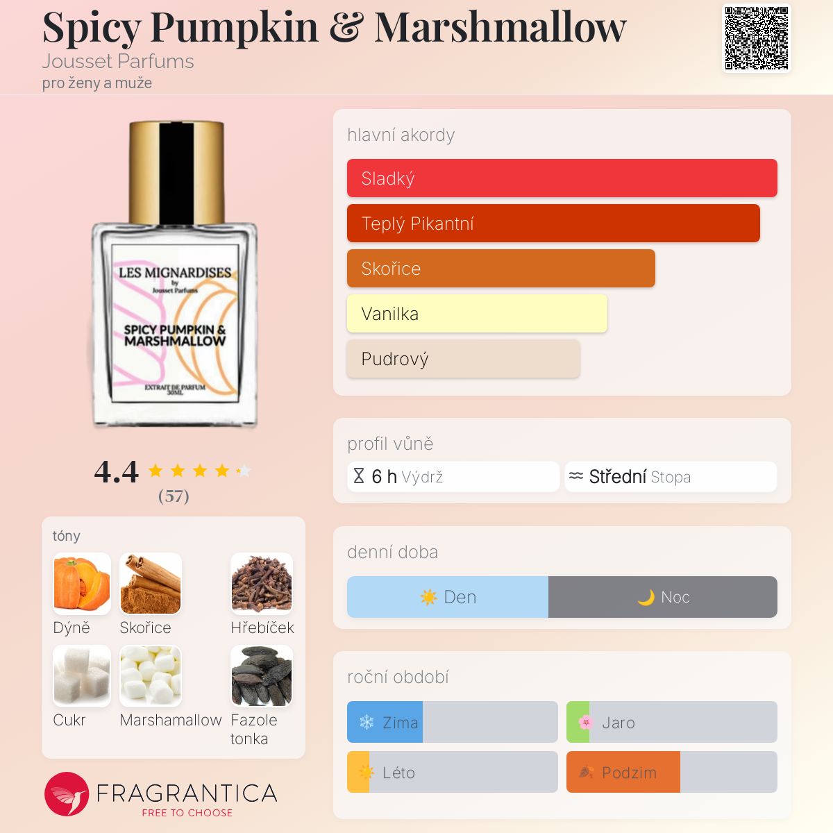 Spicy Pumpkin & Marshmallow podle Jousset Parfums je vůně pro ženy a muže. Spicy Pumpkin & Marshmallow byl/a uveden/a v roce 2021. "Nosem" za touto vůní je Jimmy Bodin. Vrchní tóny jsou Dýně, Skořice a Hřebíček; střední tóny jsouCukr, Fazole tonka a Pšenice ; základní tóny jsou Dýně, Marshamallow a Santalové dřevo.