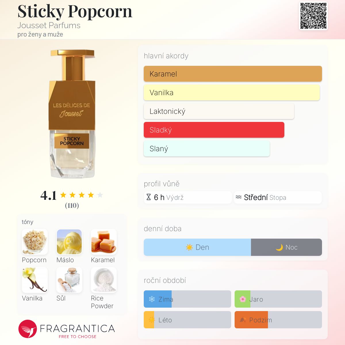 Sticky Popcorn podle Jousset Parfums je vůně pro ženy a muže. Toto je nová vůně. Sticky Popcorn byl/a uveden/a v roce 2024. "Nosem" za touto vůní je Jimmy Bodin. Vrchní tóny jsou Popcorn, Máslo a Sůl; střední tóny jsouKaramel a Vanilkový cukr ; základní tóny jsou Mořská sůl a Rýžový pudr.
