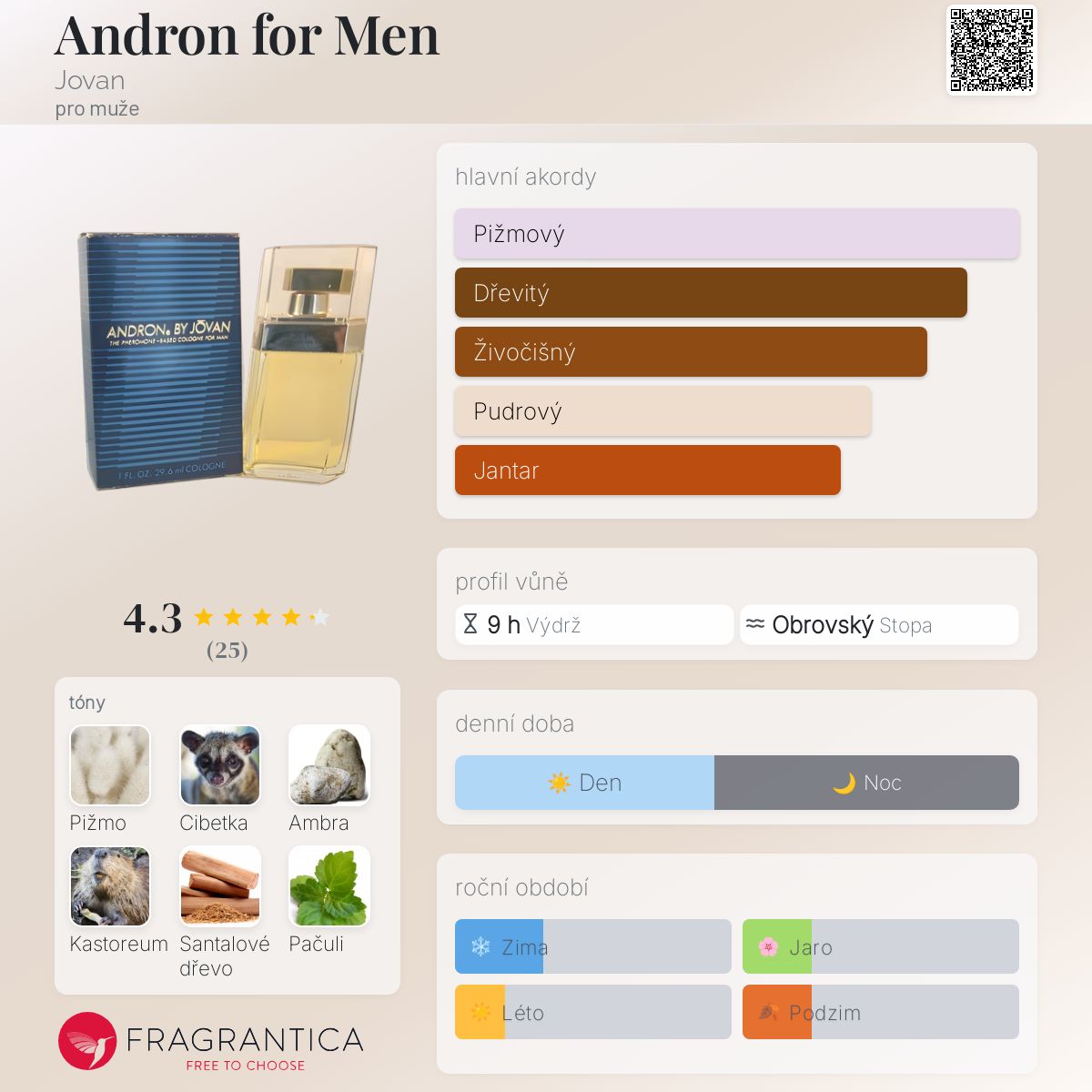 Andron for Men podle Jovan je Woody Aromatic vůně pro muže. Andron for Men byl/a uveden/a v roce 1981. Vrchní tóny jsou Bylinné tóny a Citrusy; střední tóny jsouSantalové dřevo, Pačuli a Dřevité tóny ; základní tóny jsou Pižmo, Cibetka, Ambra a Kastoreum.