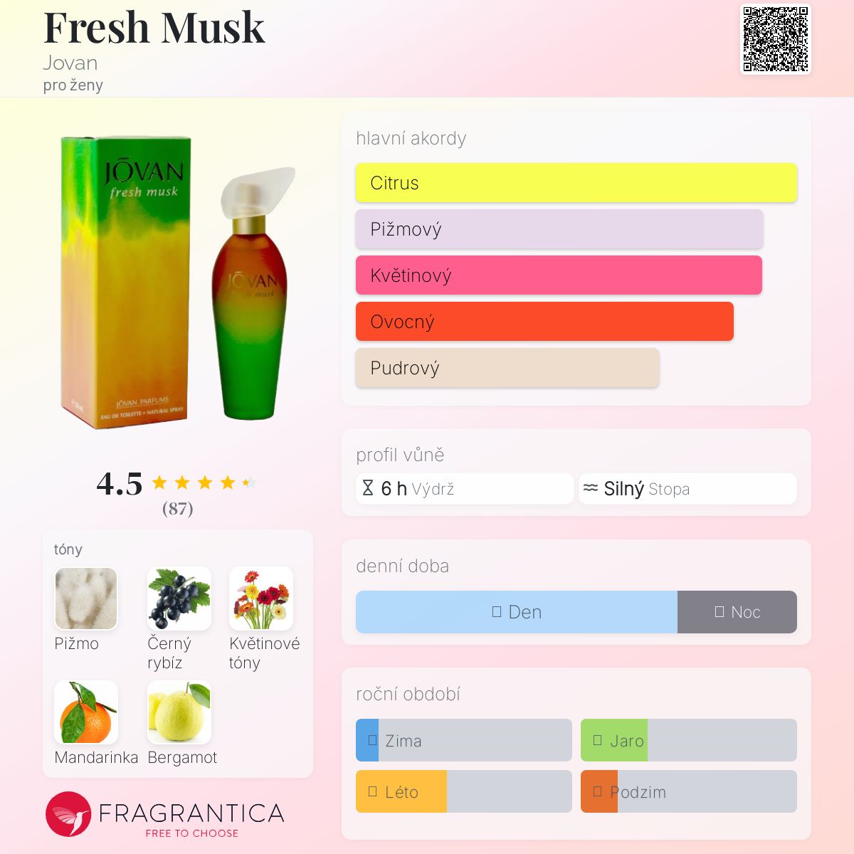 Fresh Musk podle Jovan je Floral Fruity vůně pro ženy. Fresh Musk byl/a uveden/a v roce 1996. Vrchní tóny jsou Černý rybíz, Mandarinka a Bergamot; střední tón jeKvětinové tóny ; základní tón je Pižmo.