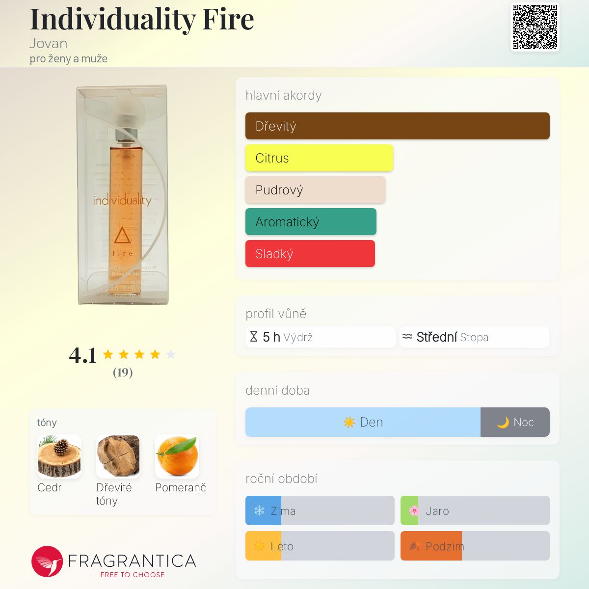 Individuality Fire podle Jovan je Woody vůně pro ženy a muže. Individuality Fire byl/a uveden/a v roce 2000.