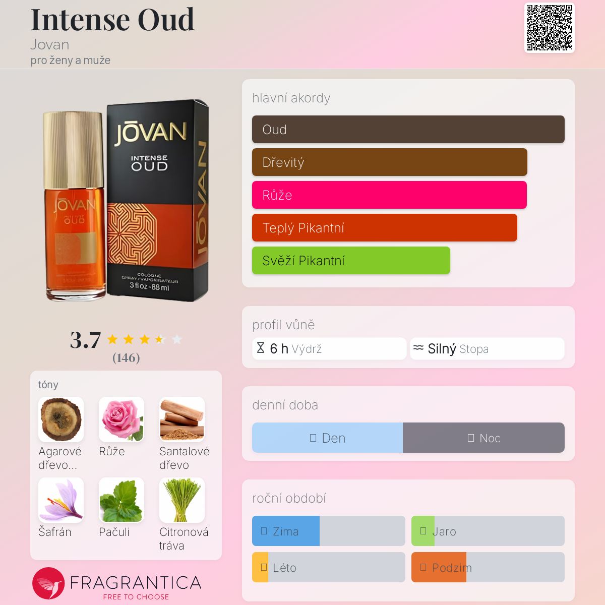 Intense Oud podle Jovan je Orientální Woody vůně pro ženy a muže. Intense Oud byl/a uveden/a v roce 2012. Vrchní tóny jsou Šafrán a Citronová tráva; střední tóny jsouTurecká růže a Labdanum ; základní tóny jsou Agarové dřevo (oud), Santalové dřevo a Pačuli.