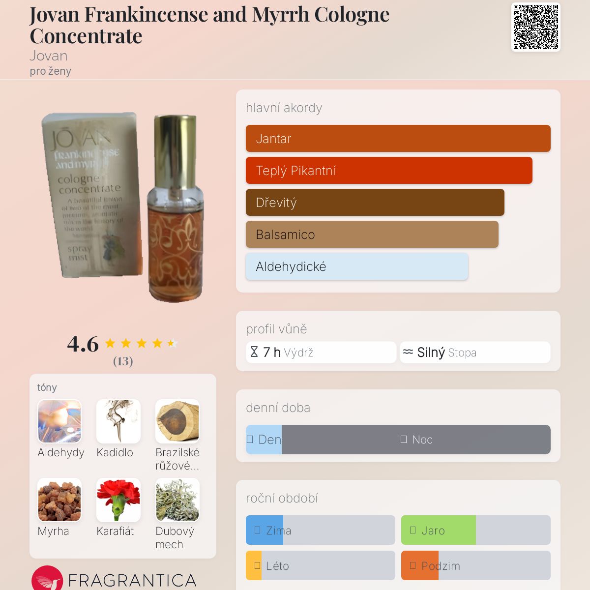 Jovan Frankincense and Myrrh Cologne Concentrate podle Jovan je Orientální vůně pro ženy. Jovan Frankincense and Myrrh Cologne Concentrate byl/a uveden/a v roce 1974. Vrchní tóny jsou Aldehydy, Bergamot a Maliny; střední tóny jsouBrazilské růžové dřevo, Karafiát, Konvalinka, Jasmín, Med, Růže a Kosatec ; základní tóny jsou Kadidlo, Myrha, Mech, Santalové dřevo, Skořice, Benzoin a Pižmo.