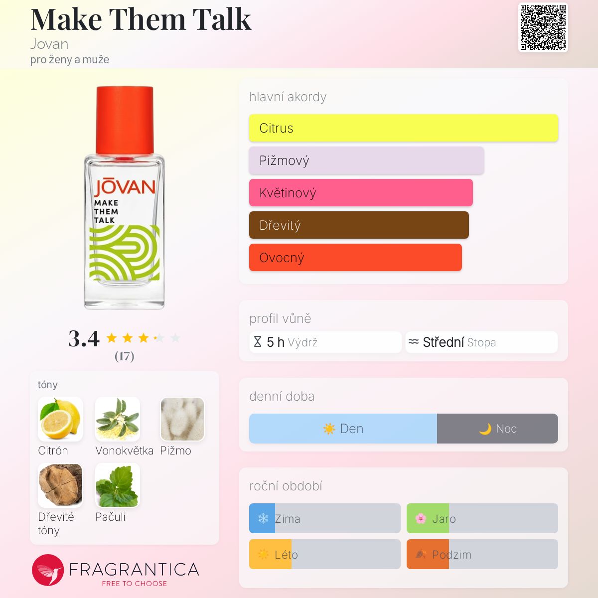 Make Them Talk podle Jovan je Floral Woody Musk vůně pro ženy a muže. Toto je nová vůně. Make Them Talk byl/a uveden/a v roce 2024. Vrchní tón je Citronová kůra ; střední tón jeVonokvětka ; základní tóny jsou Pižmo, Dřevité tóny a Pačuli.