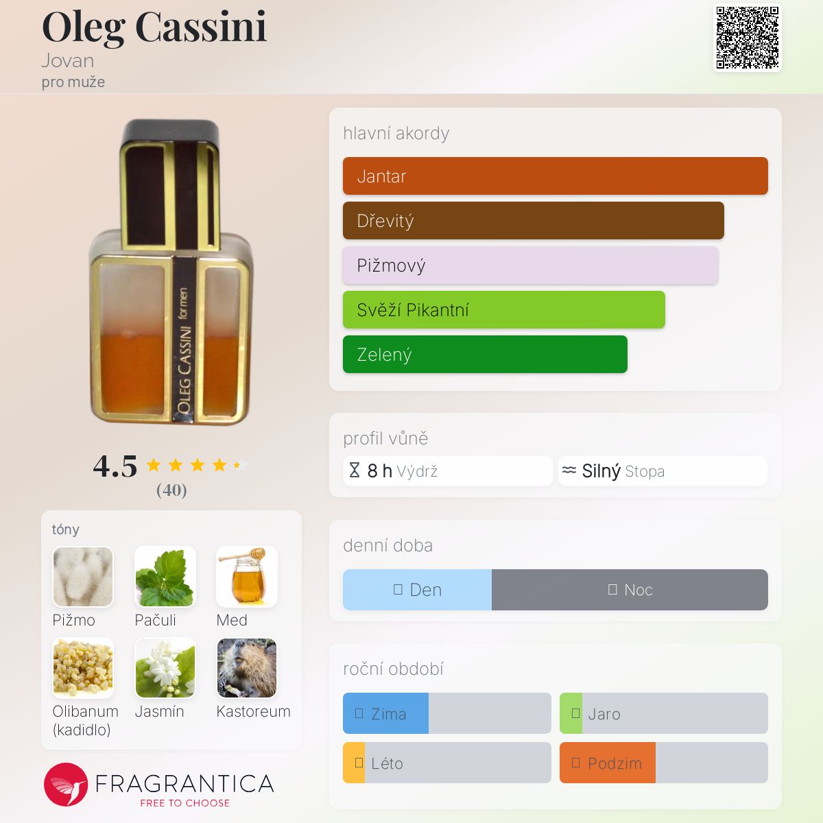 Oleg Cassini podle Jovan je vůně pro muže. Oleg Cassini byl/a uveden/a v roce 1976. Vrchní tóny jsou Citrusy, Zelené tóny a Ovocné tóny; střední tóny jsouPačuli, Med, Jasmín, Seno, Vetiver, Pelargónie a Růže ; základní tóny jsou Pižmo, Olibanum, Kastoreum, Labdanum, Jantar (ambra) a Vanilka.