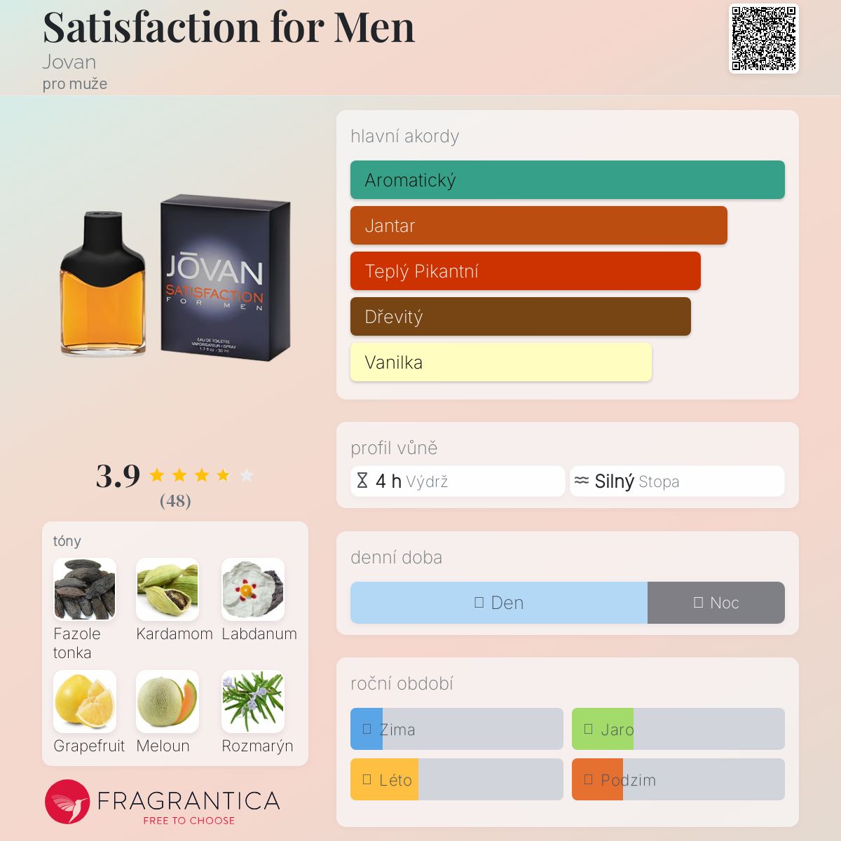 Satisfaction for Men podle Jovan je Orientální Spicy vůně pro muže. Satisfaction for Men byl/a uveden/a v roce 2010. Vrchní tóny jsou Grapefruit, Meloun a Bazalka; střední tóny jsouKardamom, Rozmarýn a Virginský cedr ; základní tóny jsou Fazole tonka a Francouzské labdanum.