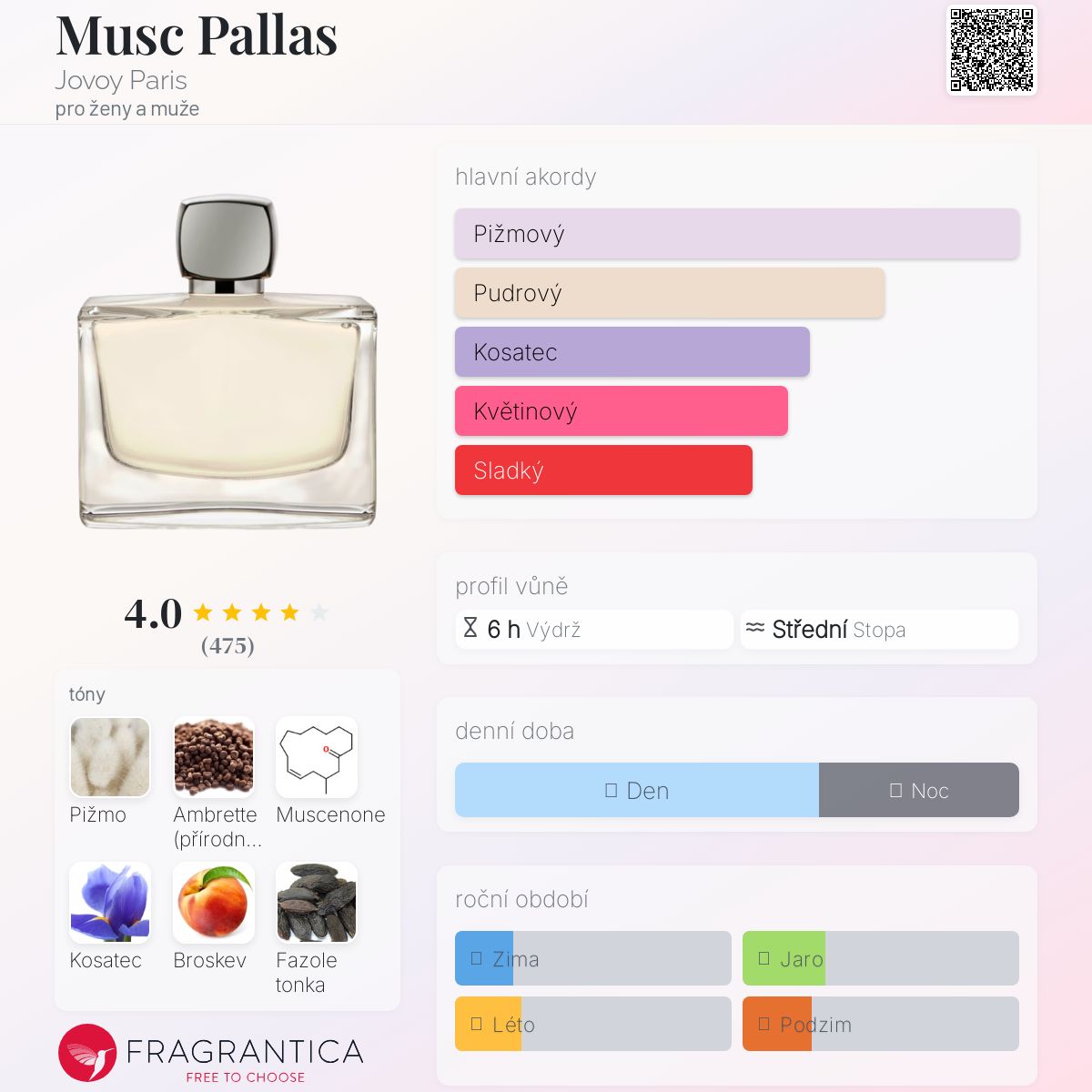 Musc Pallas podle Jovoy Paris je Woody Floral Musk vůně pro ženy a muže. Musc Pallas byl/a uveden/a v roce 2023. "Nosem" za touto vůní je Vanina Muracciole. Vrchní tóny jsou Ambrette (přírodní pižmo) a Bergamot; střední tóny jsouKosatec a Broskev ; základní tóny jsou Pižmo, Muscenone a Fazole tonka.