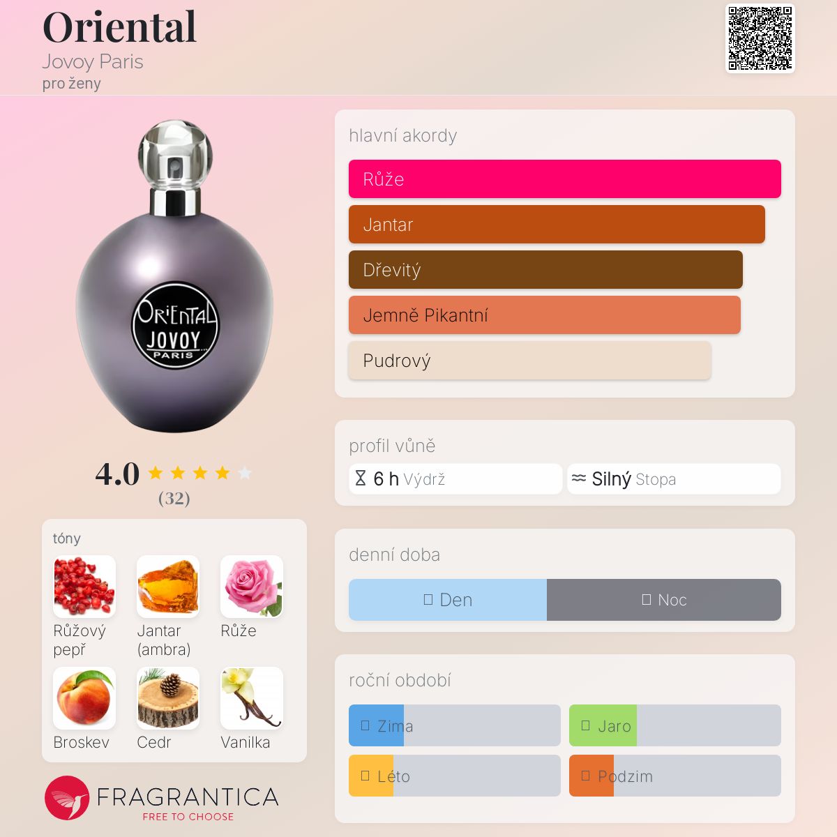 Oriental podle Jovoy Paris je Orientální vůně pro ženy. Oriental byl/a uveden/a v roce 2007. "Nosem" za touto vůní je Amandine Clerc-Marie. Vrchní tóny jsou Růžový pepř a Bergamot; střední tóny jsouRůže a Broskev ; základní tóny jsou Jantar (ambra), Cedr a Vanilka.