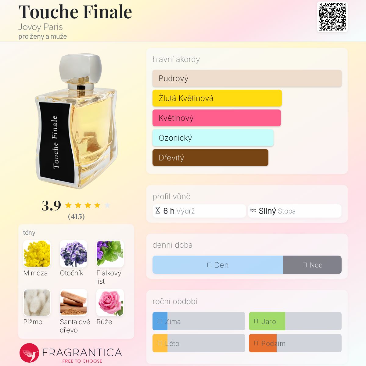 Touche Finale podle Jovoy Paris je Floral vůně pro ženy a muže. Touche Finale byl/a uveden/a v roce 2019. "Nosem" za touto vůní je Vanina Muracciole. Vrchní tóny jsou Mimóza a Růžový pepř; střední tóny jsouFialkový list, Růže, Jasmín a Cedr ; základní tóny jsou Otočník, Bílé pižmo a Santalové dřevo.