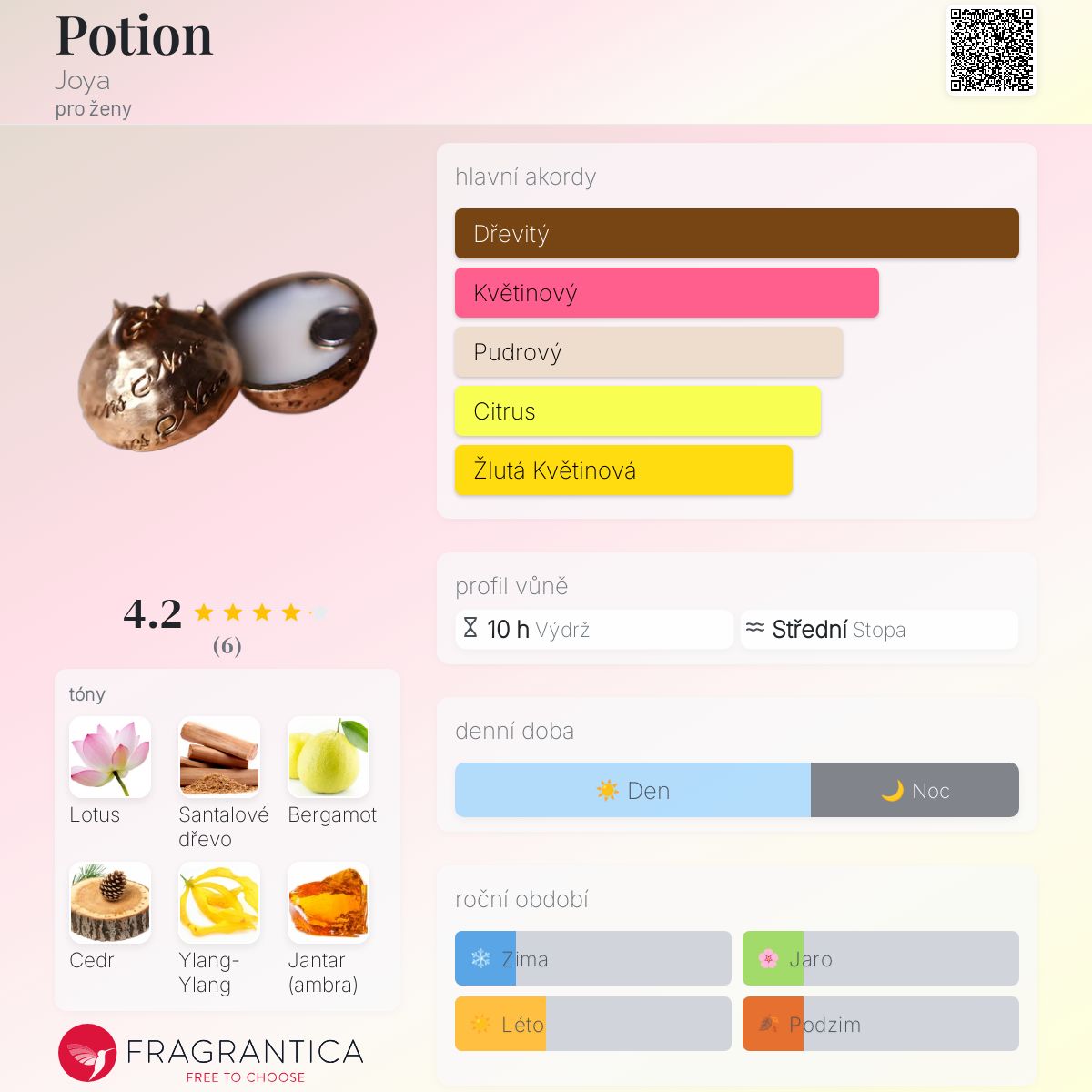 Potion podle Joya je Woody Aromatic vůně pro ženy. Potion byl/a uveden/a v roce 2009. "Nosem" za touto vůní je Rayda Vega. Vrchní tóny jsou Lotus, Bergamot a Levandule; střední tóny jsouSantalové dřevo, Virginský cedr a Ylang-Ylang ; základní tóny jsou Jantar (ambra) a Vanilka.