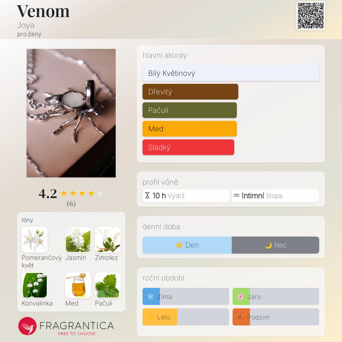 Venom podle Joya je Floral vůně pro ženy. Venom byl/a uveden/a v roce 2009. "Nosem" za touto vůní je Rayda Vega. Vrchní tóny jsou Květ afrického pomeranče a Zimolez; střední tóny jsouJasmín, Konvalinka a Bílý med ; základní tóny jsou Pačuli, Vetiver a Jantar (ambra).