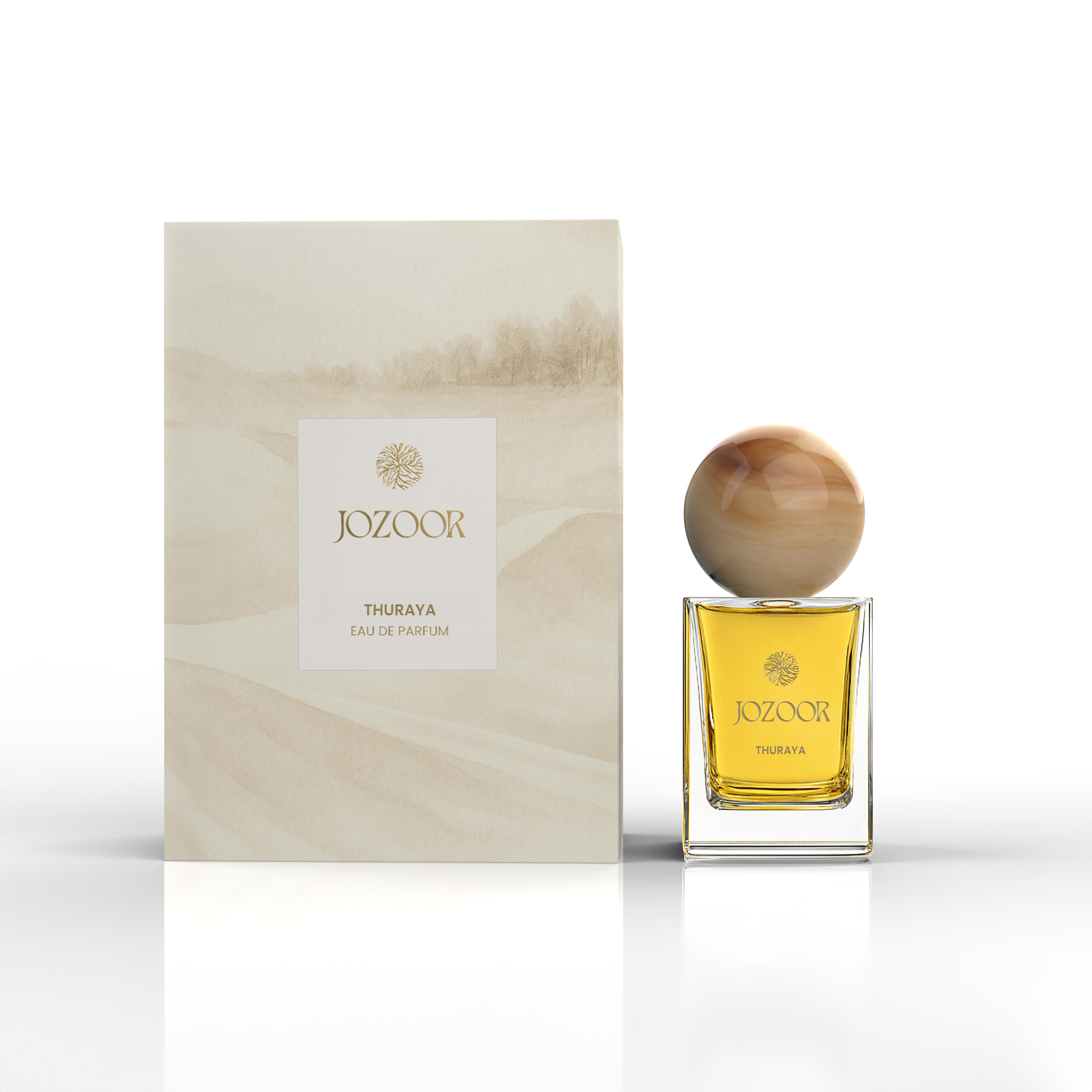 Thuraya podle Jozoor je Floral Fruity Gourmand vůně pro ženy a muže. Toto je nová vůně. Thuraya byl/a uveden/a v roce 2025. Vrchní tóny jsou Bílá broskev, Broskvový květ a Černý rybíz; střední tóny jsouRůže, Karamel, Ananas, Cukr a Kašmírové dřevo ; základní tóny jsou Jantar (ambra), Santalové dřevo, Bílé pižmo a Pačuli.