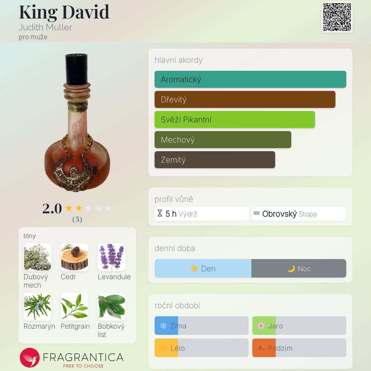 King David podle Judith Muller je Aromatic Fougere vůně pro muže. King David byl/a uveden/a v roce 1974. Vrchní tóny jsou Levandule, Rozmarýn, Petitgrain, Vavříny a Bergamot; střední tóny jsouKarafiát, Aldehydy, Borovice, Pelargónie, Skořice, Růže a Kapradina ; základní tóny jsou Dubový mech, Cedr, Pižmo, Fazole tonka, Jantar (ambra) a Jedle.