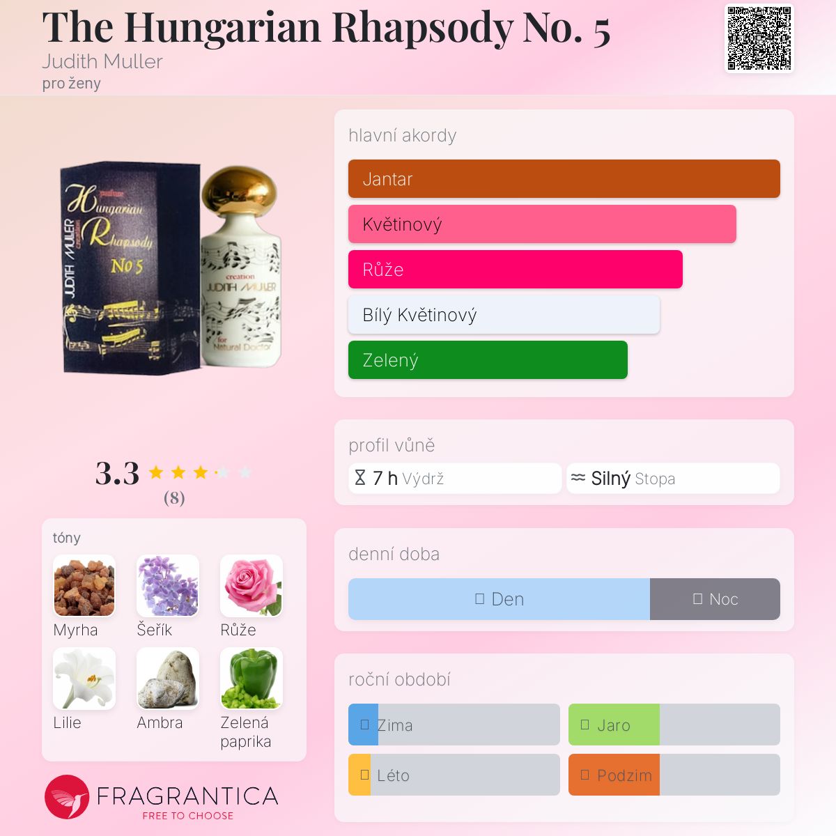 The Hungarian Rhapsody No. 5 podle Judith Muller je Floral vůně pro ženy. The Hungarian Rhapsody No. 5 byl/a uveden/a v roce 2005. "Nosem" za touto vůní je Pierre Bourdon. Vrchní tón je Zelená paprika ; střední tóny jsouŠeřík, Růže, Lilie a Jasmín ; základní tóny jsou Myrha a Ambra.