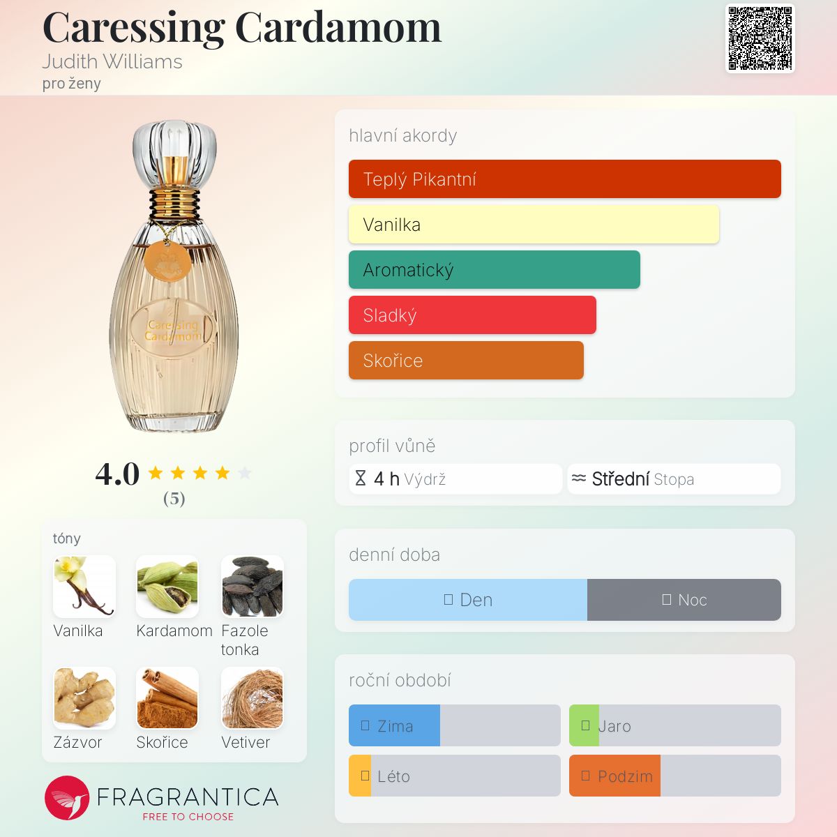Caressing Cardamom podle Judith Williams je Orientální Vanilla vůně pro ženy. Caressing Cardamom byl/a uveden/a v roce 2012. Caressing Cardamom byl/a vytvořen/a Pierre Bourdon a Julien Rasquinet. Vrchní tóny jsou Kardamom a Bergamot; střední tóny jsouFazole tonka, Zázvor a Skořice ; základní tóny jsou Vanilka, Vetiver a Hořká čokoláda.