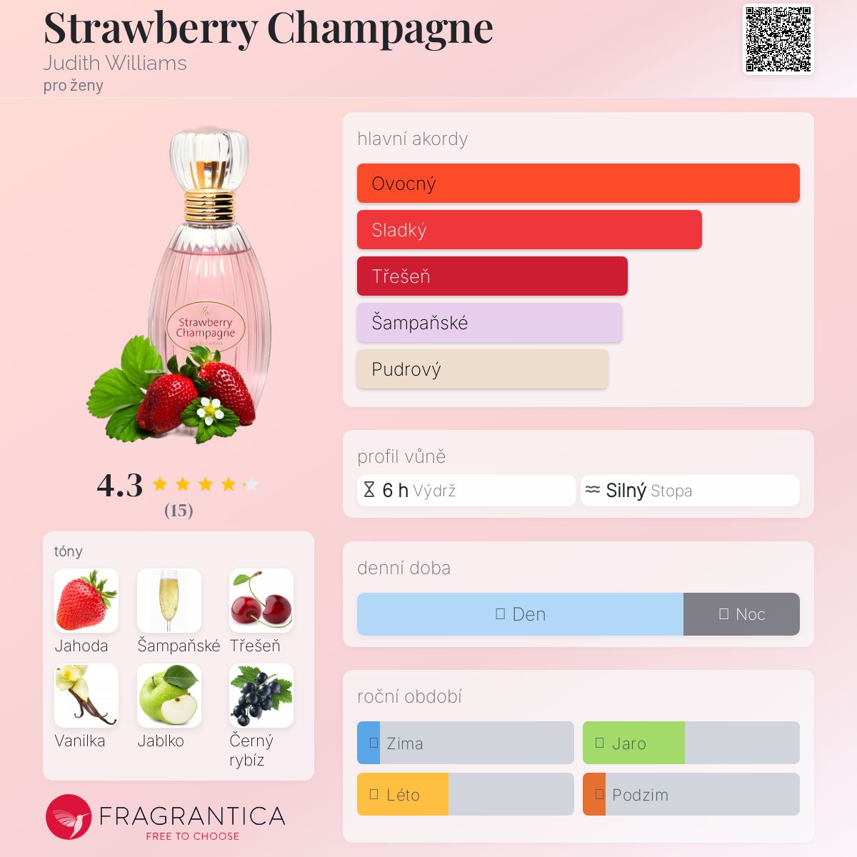 Strawberry Champagne podle Judith Williams je Floral Fruity Gourmand vůně pro ženy. Strawberry Champagne byl/a uveden/a v roce 2013. Strawberry Champagne byl/a vytvořen/a Pierre Bourdon a Julien Rasquinet. Vrchní tóny jsou Velká jahoda, Třešeň, Jablko a Broskev; střední tóny jsouŠampaňské, Černý rybíz, Růže a Fialka ; základní tóny jsou Vanilka, Pižmo a Santalové dřevo.