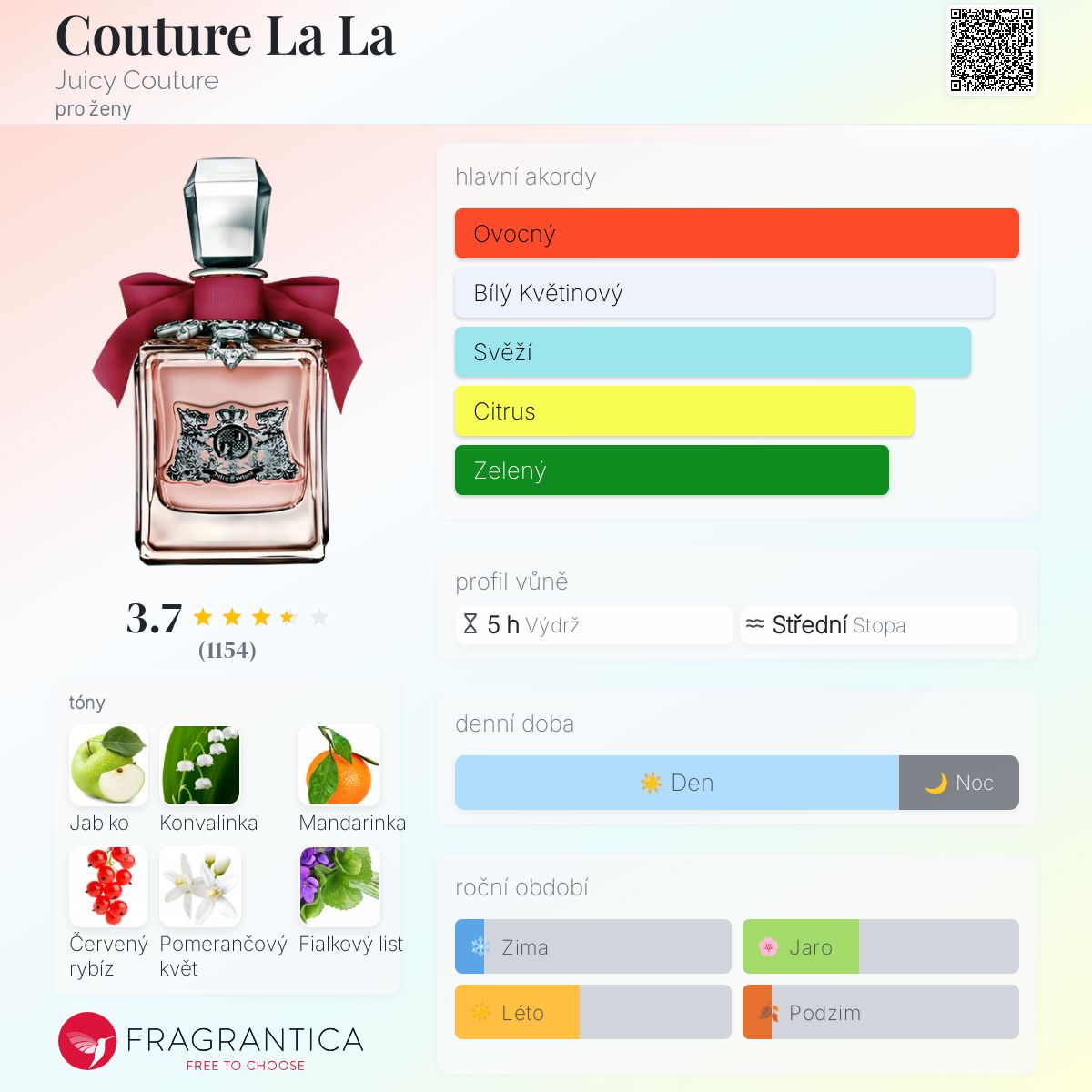 Couture La La podle Juicy Couture je Floral Fruity vůně pro ženy. Couture La La byl/a uveden/a v roce 2012. Vrchní tóny jsou Zelené jablko, Mandarinka a Červený rybíz; střední tóny jsouKonvalinka, Pomerančový květ a Fialkový list ; základní tón je Pižmo.