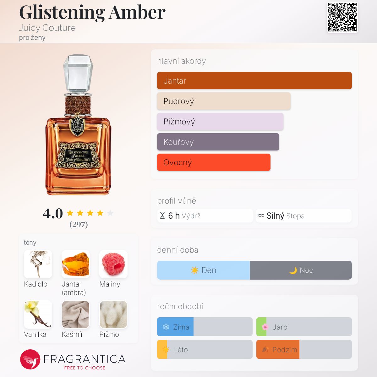 Glistening Amber podle Juicy Couture je Orientální Floral vůně pro ženy. Glistening Amber byl/a uveden/a v roce 2018. Vrchní tóny jsou Maliny a Plumérie; střední tóny jsouKadidlo, Vanilka a Orris ; základní tóny jsou Jantar (ambra), Kašmír a Pižmo.