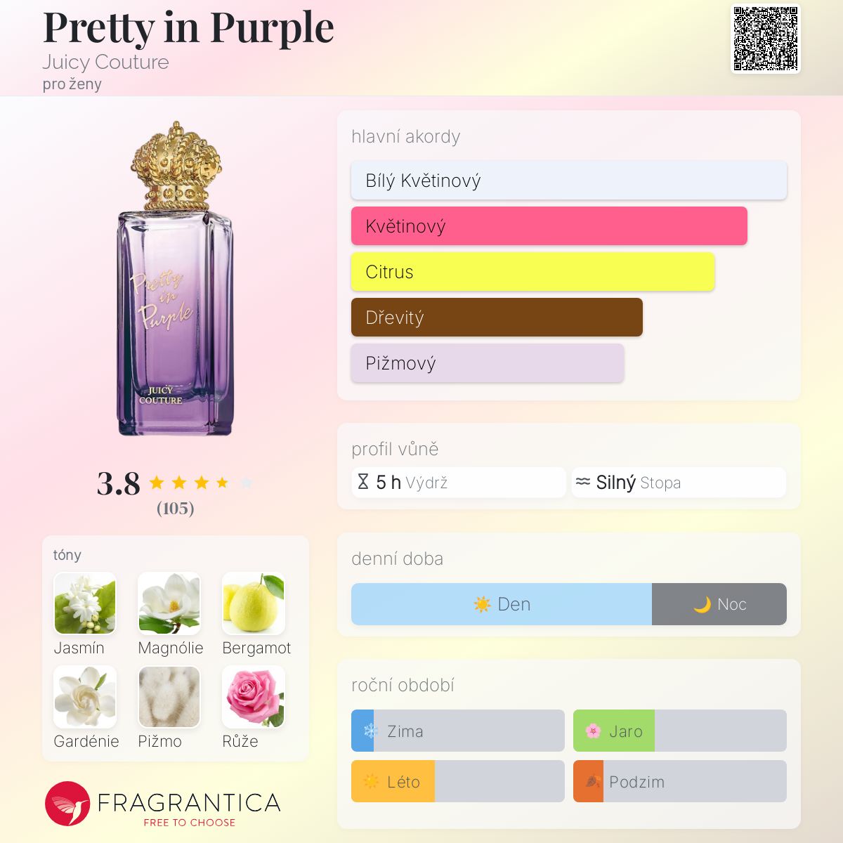 Pretty in Purple podle Juicy Couture je Floral Woody Musk vůně pro ženy. Vrchní tóny jsou Magnólie, Bergamot a Růžový pepř; střední tóny jsouJasmín Sambac, Gardénie a Turecký růžový olej ; základní tóny jsou Pižmo, Cedr a Vetiver.