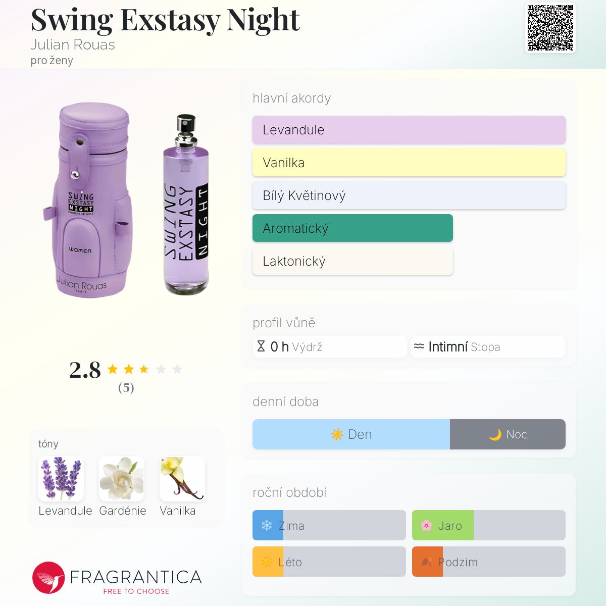 Swing Exstasy Night podle Julian Rouas je Aromatic vůně pro ženy. Vrchní tóny jsou Levandule a Gardénie; základní tón je Vanilka.