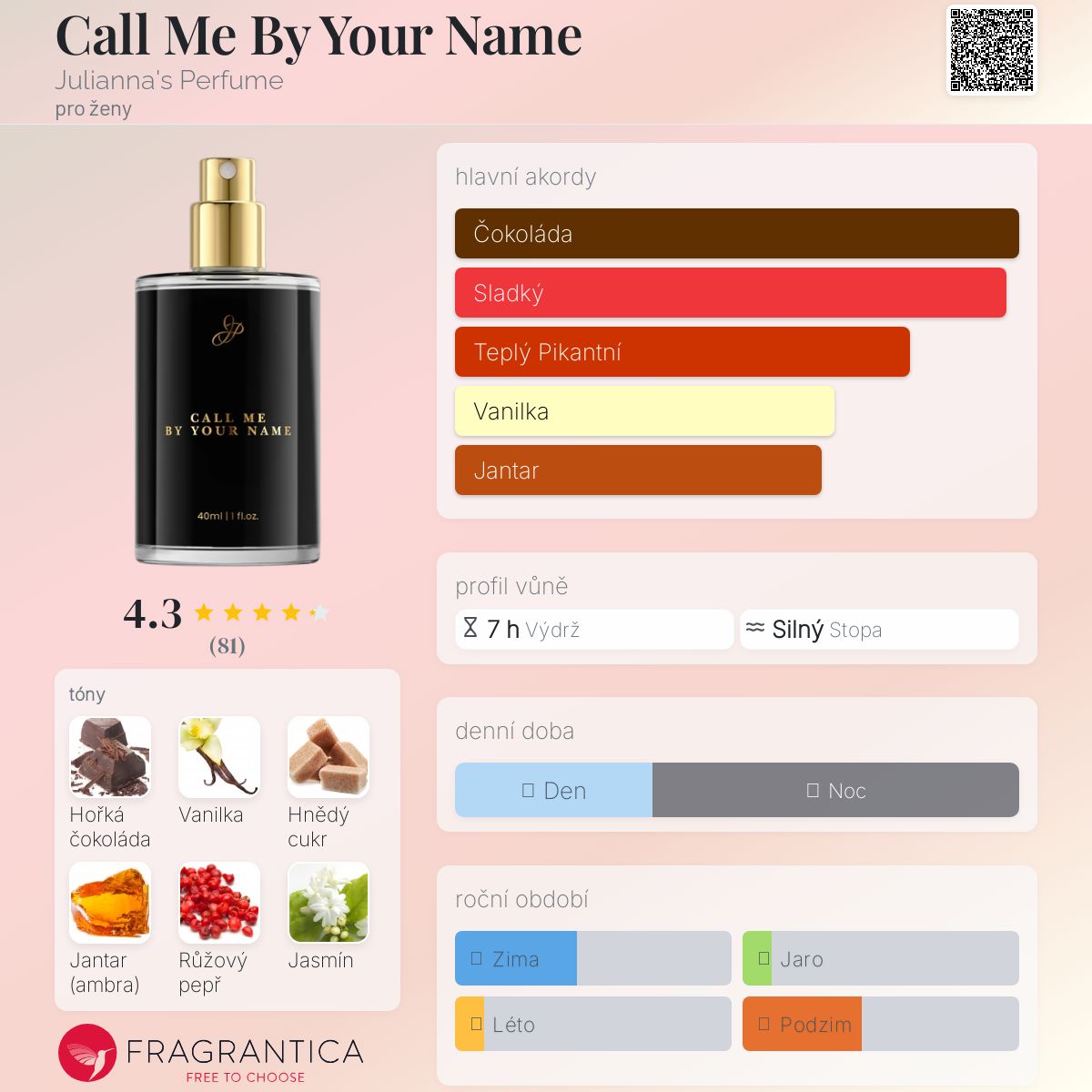Call Me By Your Name podle Julianna's Perfume je Orientální Vanilla vůně pro ženy. Call Me By Your Name byl/a uveden/a v roce 2021. Vrchní tóny jsou Čokoláda a Růžový pepř; střední tóny jsouVanilka, Jantar (ambra) a Jasmín ; základní tóny jsou Hnědý cukr, Labdanum, Benzoin a Pižmo.