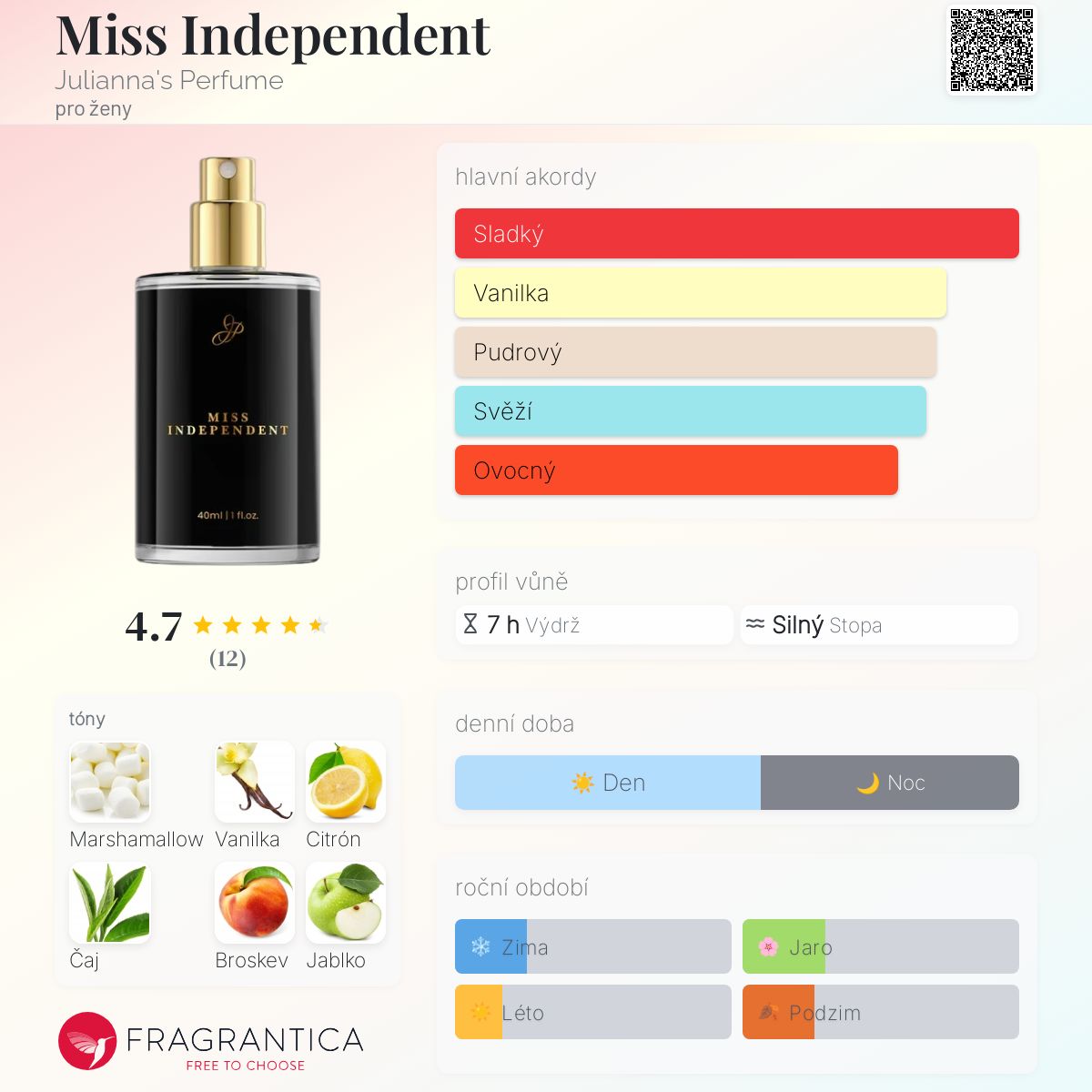 Miss Independent podle Julianna's Perfume je vůně pro ženy. Vrchní tón je Citrón ; střední tóny jsouZelený čaj, Broskev, Jablko, Jasmín, Hedione a Zázvor ; základní tóny jsou Marshamallow, Vanilka a Benzoin.