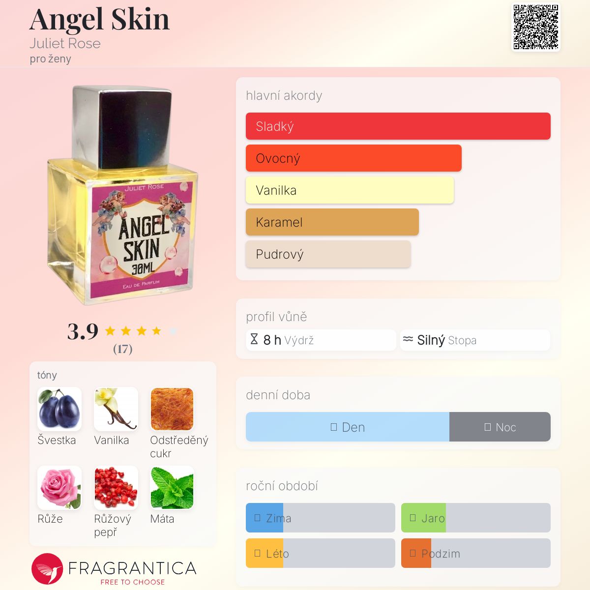 Angel Skin podle Juliet Rose je Floral Fruity Gourmand vůně pro ženy. Angel Skin byl/a uveden/a v roce 2016. "Nosem" za touto vůní je Juliet Rose. Vrchní tóny jsou Odstředěný cukr, Růže, Růžový pepř, Máta a Med; střední tóny jsouŠvestka, Máslový krém, Sladké tóny, Ananas a Pižmo ; základní tóny jsou Vanilka, Karamel, Cedr a Fazole tonka.