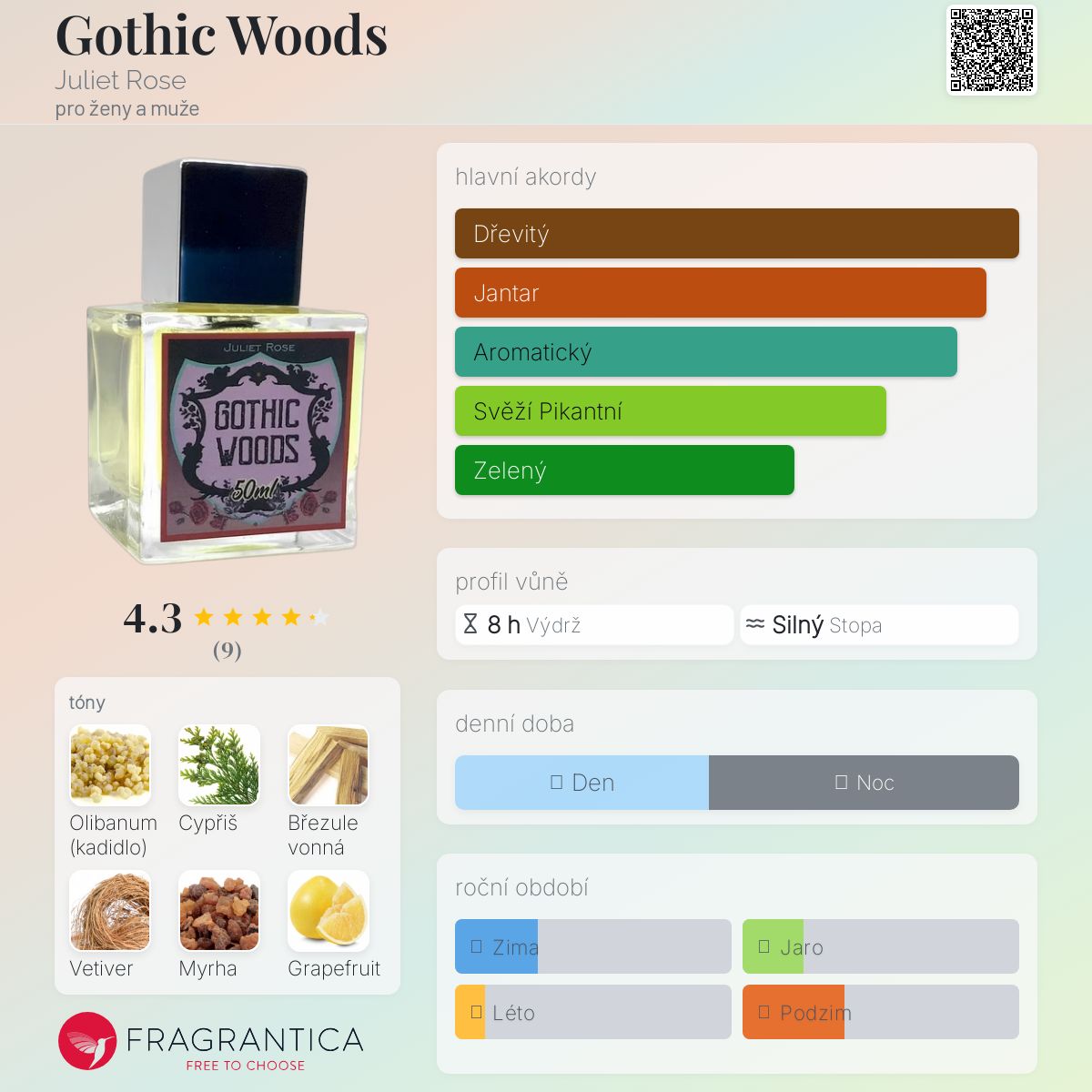 Gothic Woods podle Juliet Rose je Woody vůně pro ženy a muže. Gothic Woods byl/a uveden/a v roce 2023. "Nosem" za touto vůní je Juliet Rose. Vrchní tóny jsou Grapefruit, Bazalka a Borovice; střední tóny jsouCypřiš, Březule vonná, Palmarosa (palma růžová) a Dřevo Ho ; základní tóny jsou Kadidlo, Cypřiš, Vetiver, Myrha a Jantar (ambra).