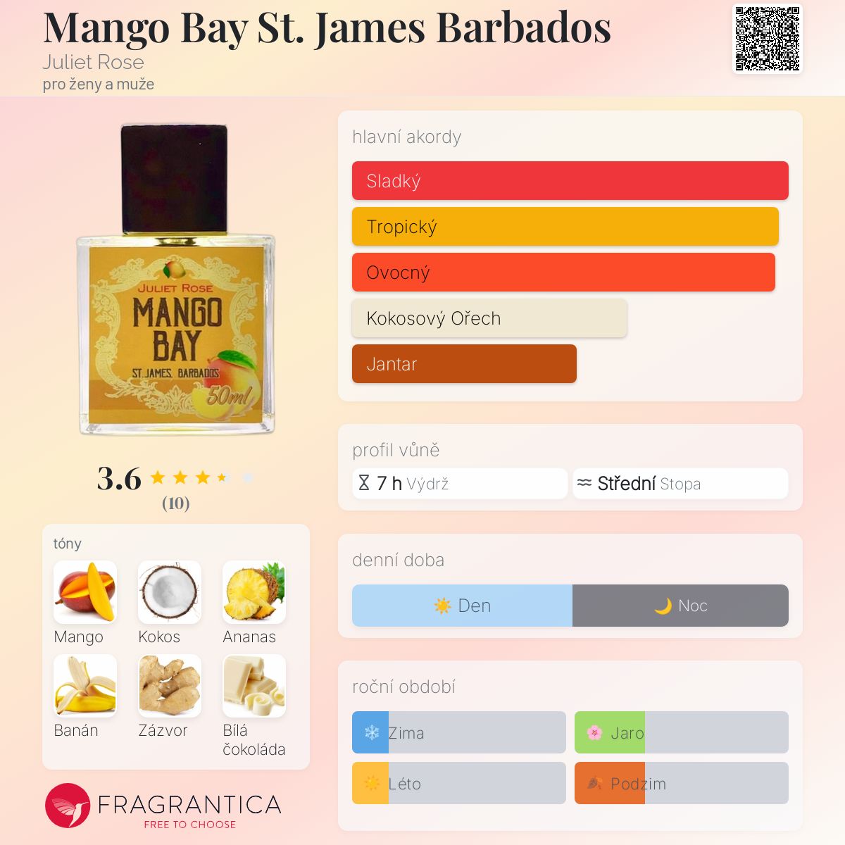 Mango Bay St. James Barbados podle Juliet Rose je Floral Fruity Gourmand vůně pro ženy a muže. Toto je nová vůně. Mango Bay St. James Barbados byl/a uveden/a v roce 2024. "Nosem" za touto vůní je Juliet Rose. Vrchní tóny jsou Mango, Kokos, Ananas, Banán a Citrusy; střední tóny jsouZázvor, Bílá čokoláda, Med a Pudrové tóny ; základní tóny jsou Benzoin, Rum, Jantar (ambra), Med a Fazole tonka.