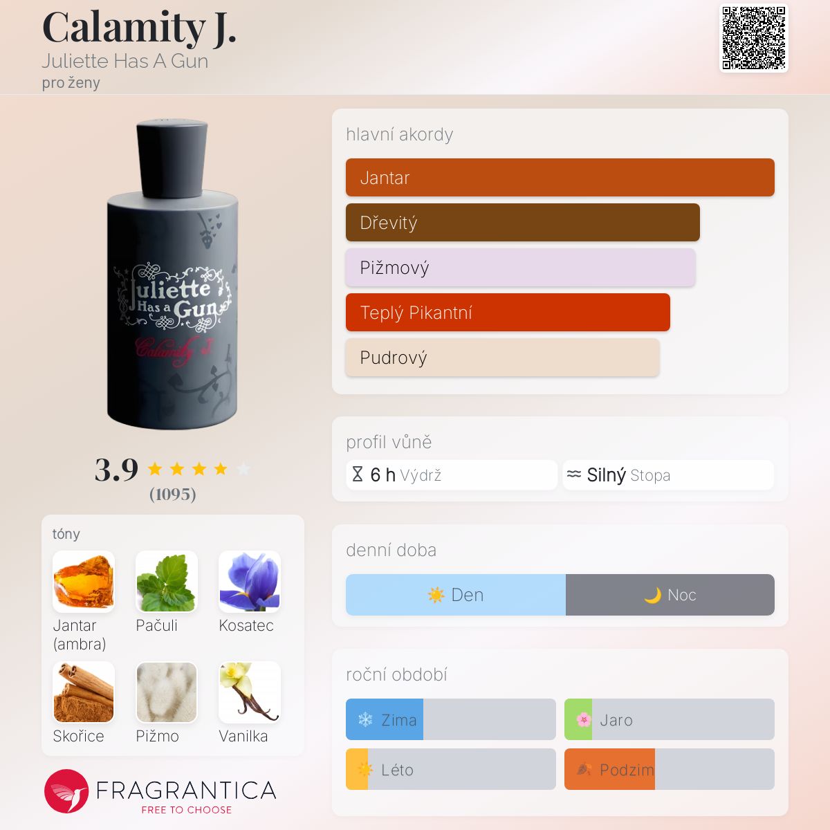 Calamity J. podle Juliette Has A Gun je vůně pro ženy. Calamity J. byl/a uveden/a v roce 2009. "Nosem" za touto vůní je Romano Ricci. Vrchní tón je Skořice ; střední tóny jsouKosatec a Iso E Super ; základní tóny jsou Jantar (ambra), Pačuli, Pižmo, Vanilka, Fazole tonka, Labdanum, Kastoreum, Cibetka a Cetalox.