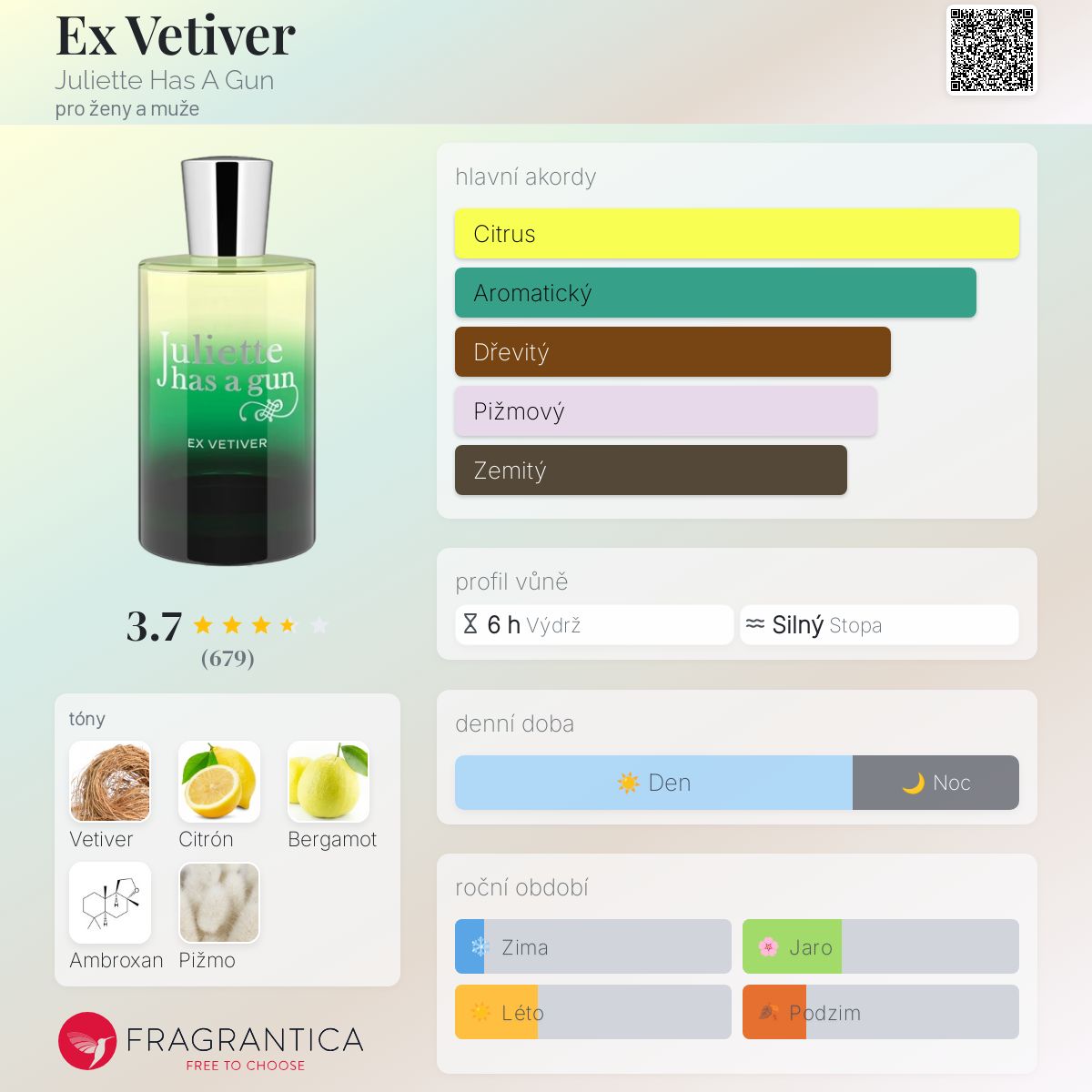 Ex Vetiver podle Juliette Has A Gun je Woody Aromatic vůně pro ženy a muže. Toto je nová vůně. Ex Vetiver byl/a uveden/a v roce 2024. "Nosem" za touto vůní je Romano Ricci. Vrchní tóny jsou Citrón a Bergamot; střední tóny jsouHaitský vetiver, Java vetiverový olej a Vetiver ; základní tóny jsou Ambroxan a Pižmo.