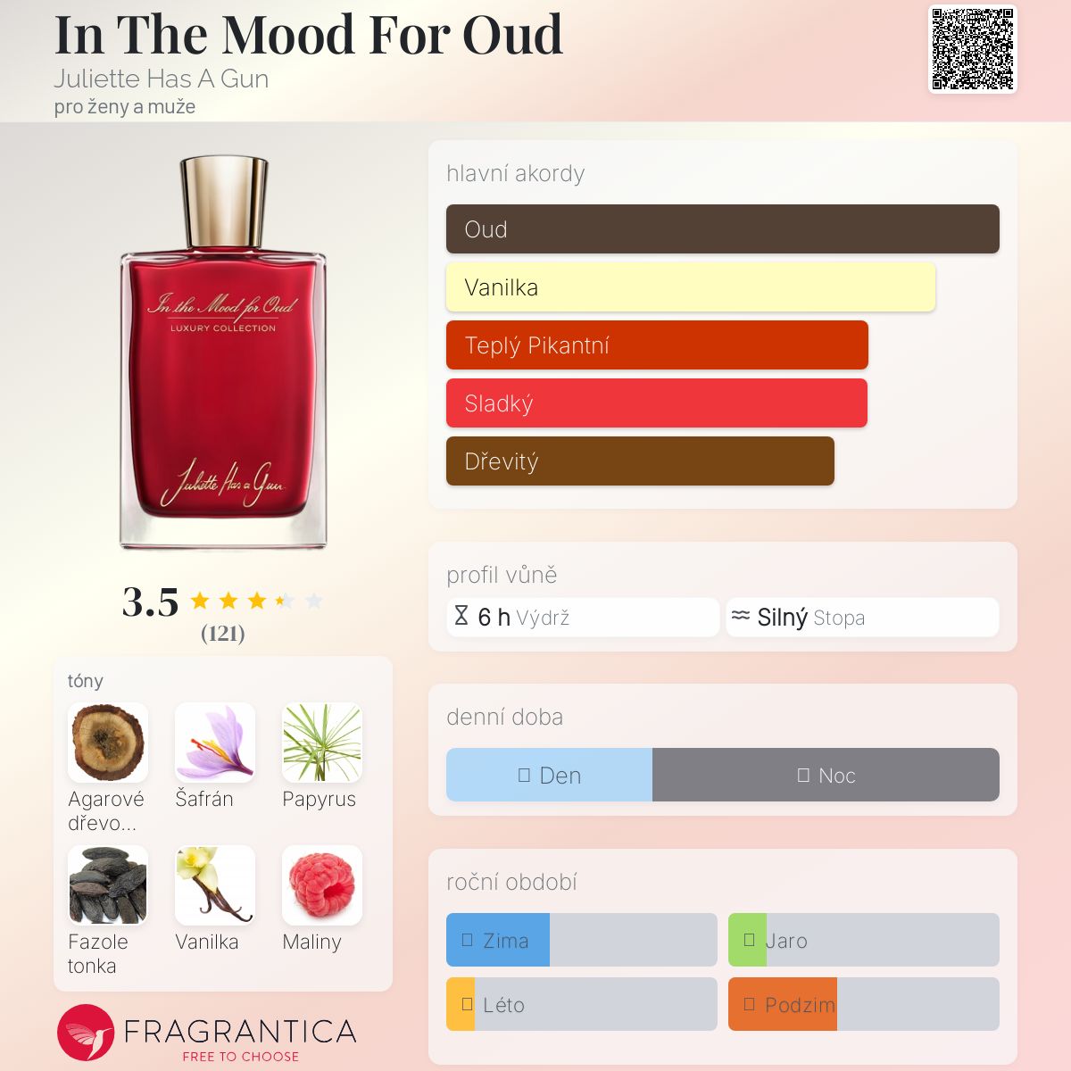 In The Mood For Oud podle Juliette Has A Gun je Orientální Woody vůně pro ženy a muže. In The Mood For Oud byl/a uveden/a v roce 2019. Vrchní tón je Bergamot ; střední tóny jsouAgarové dřevo (oud), Šafrán, Papyrus a Maliny ; základní tóny jsou Fazole tonka a Vanilka.