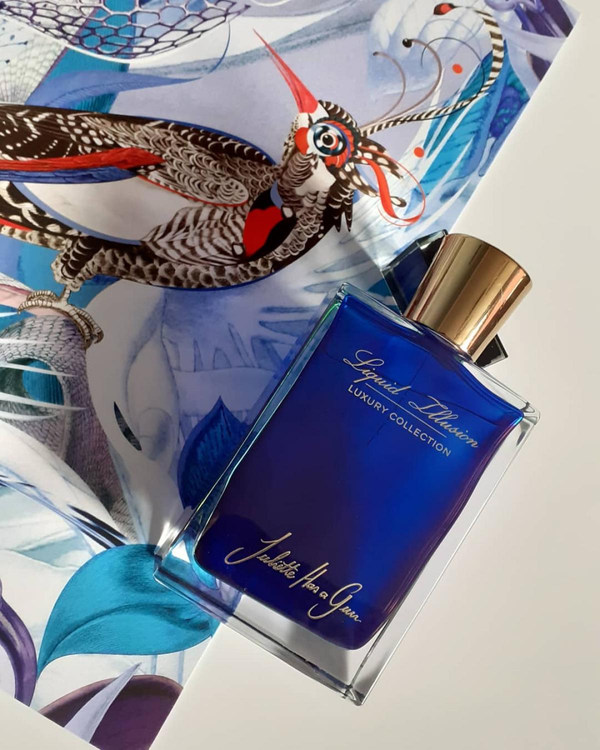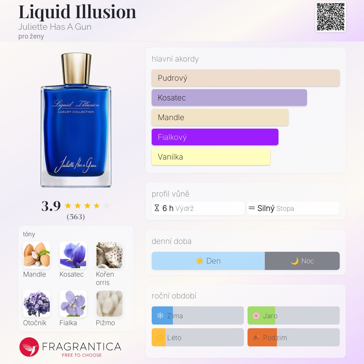 Liquid Illusion podle Juliette Has A Gun je Orientální Floral vůně pro ženy. Liquid Illusion byl/a uveden/a v roce 2018. Vrchní tóny jsou Mandle, Otočník a Fialka; střední tóny jsouKosatec, Orris a Tuberóza ; základní tóny jsou Pižmo, Fazole tonka, Jantar (ambra) a Siamský (thajský) benzoin.