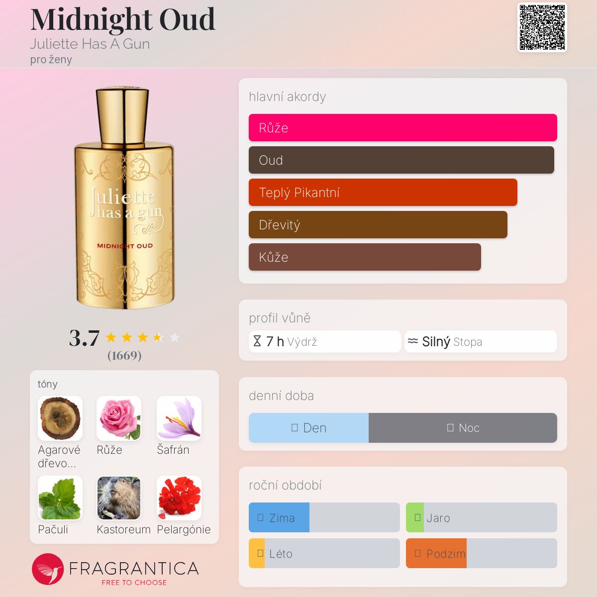 Midnight Oud podle Juliette Has A Gun je Orientální vůně pro ženy. Midnight Oud byl/a uveden/a v roce 2009. Vrchní tóny jsou Damašská růže, Šafrán, Papyrus a Bergamot; střední tóny jsouAgarové dřevo (oud), Marocká růže, Kastoreum a Pelargónie ; základní tóny jsou Pačuli, Pižmo, Jantar (ambra) a Santalové dřevo.