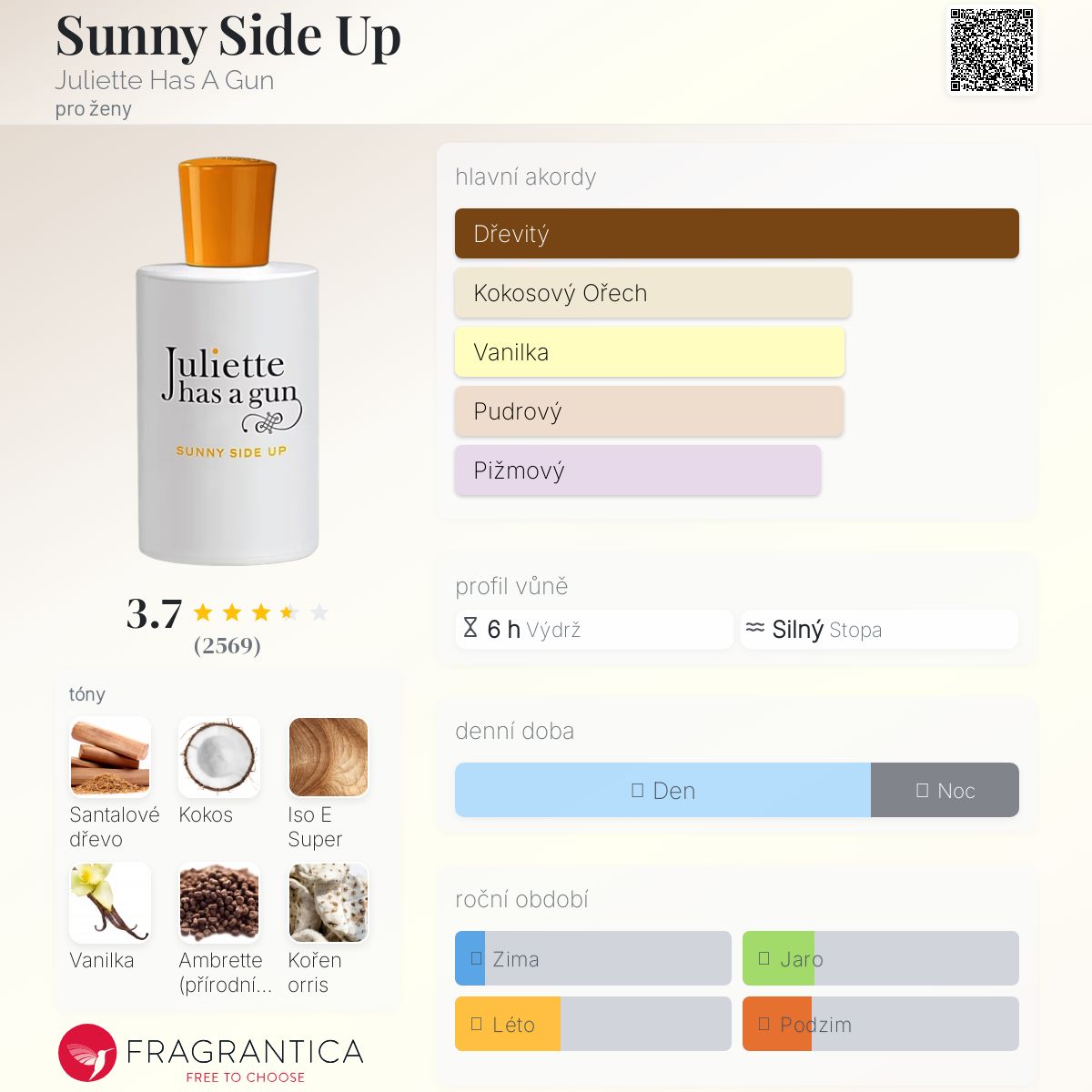 Sunny Side Up podle Juliette Has A Gun je Floral Woody Musk vůně pro ženy. Sunny Side Up byl/a uveden/a v roce 2017. "Nosem" za touto vůní je Romano Ricci. Vrchní tóny jsou Vanilka, Amyris a Jasmín; střední tóny jsouSantalové dřevo, Kokosové mléko, Kořen orris a Jasmín ; základní tóny jsou Iso E Super a Ambrette (přírodní pižmo).
